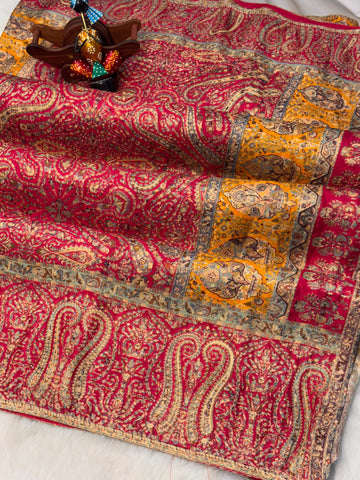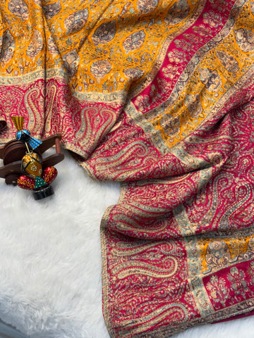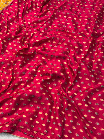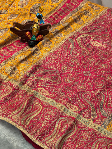 Bring the beauty of traditional Ajrakh artistry to your wardrobe with this vibrant dual-tone silk saree. Featuring a stunning mix of mustard yellow and deep maroon-red, it is adorned with: