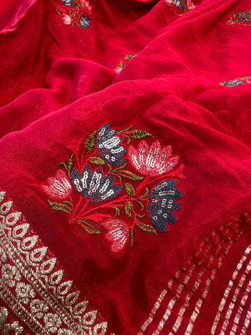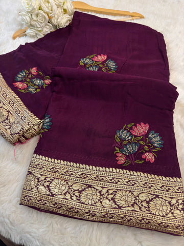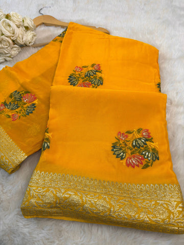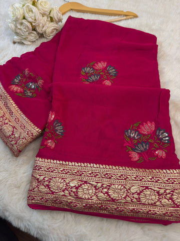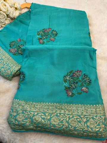 ✨ Chinon Silk Saree with Floral Zari Border & Sequin Embroidery