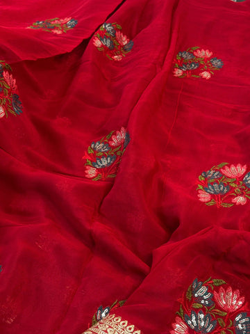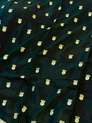 Introducing our Chinon Silk Saree Collection, crafted from soft, flowy Chinon silk and adorned with intricate floral sequin motifs and golden zari woven borders.