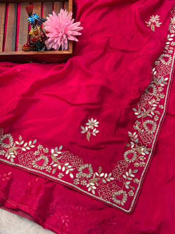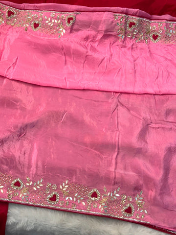 HO Silk saree featuring signature heart motifs with mirror & floral hand embroidery on the borders. Paired with a contrast designer blouse β€” perfect for festivals, gifting & elegant functions