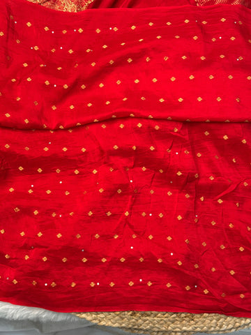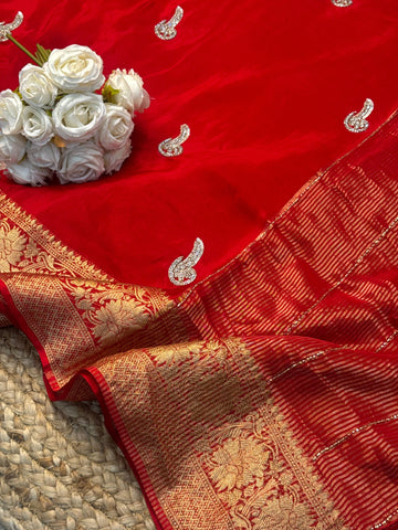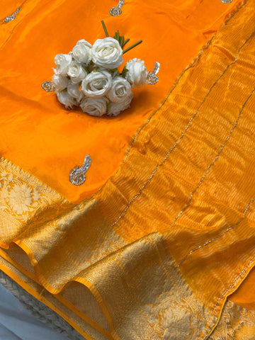 Crafted in luxurious HO silk, this saree is adorned with all-over sequin paisley buttis and a richly woven golden zari border. The pallu boasts intricate floral zari work, adding a regal touch to your festive wardrobe.