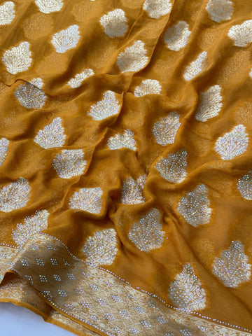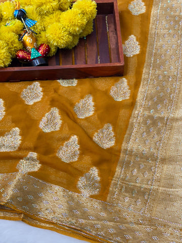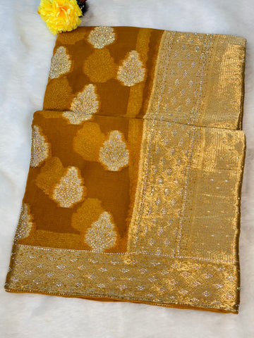 Bring grace to any festive or wedding look with this premium Khaddi Georgette saree, featuring: