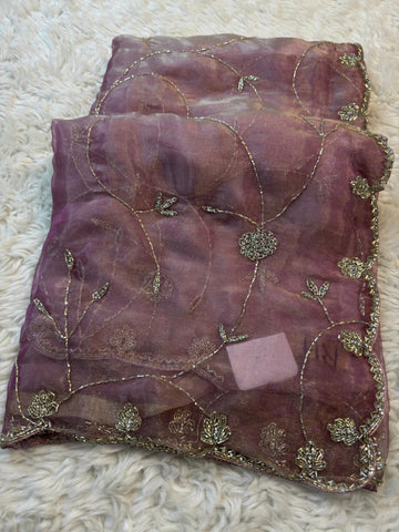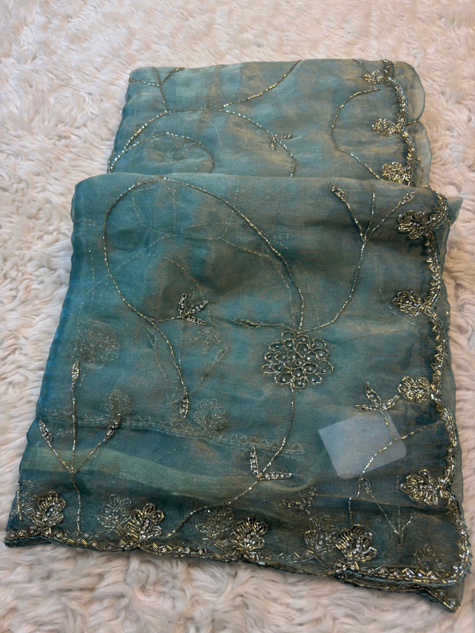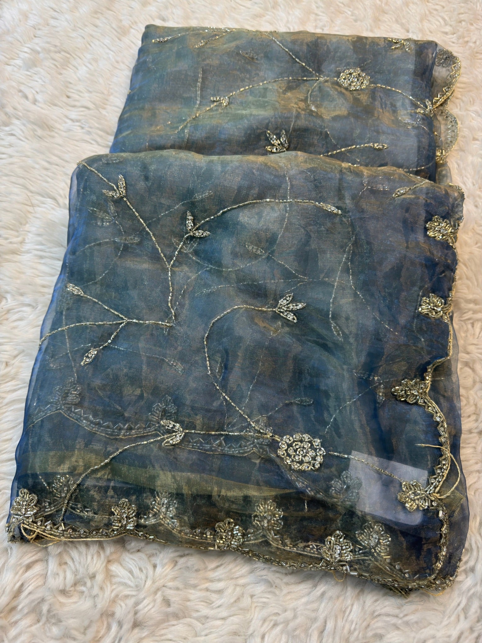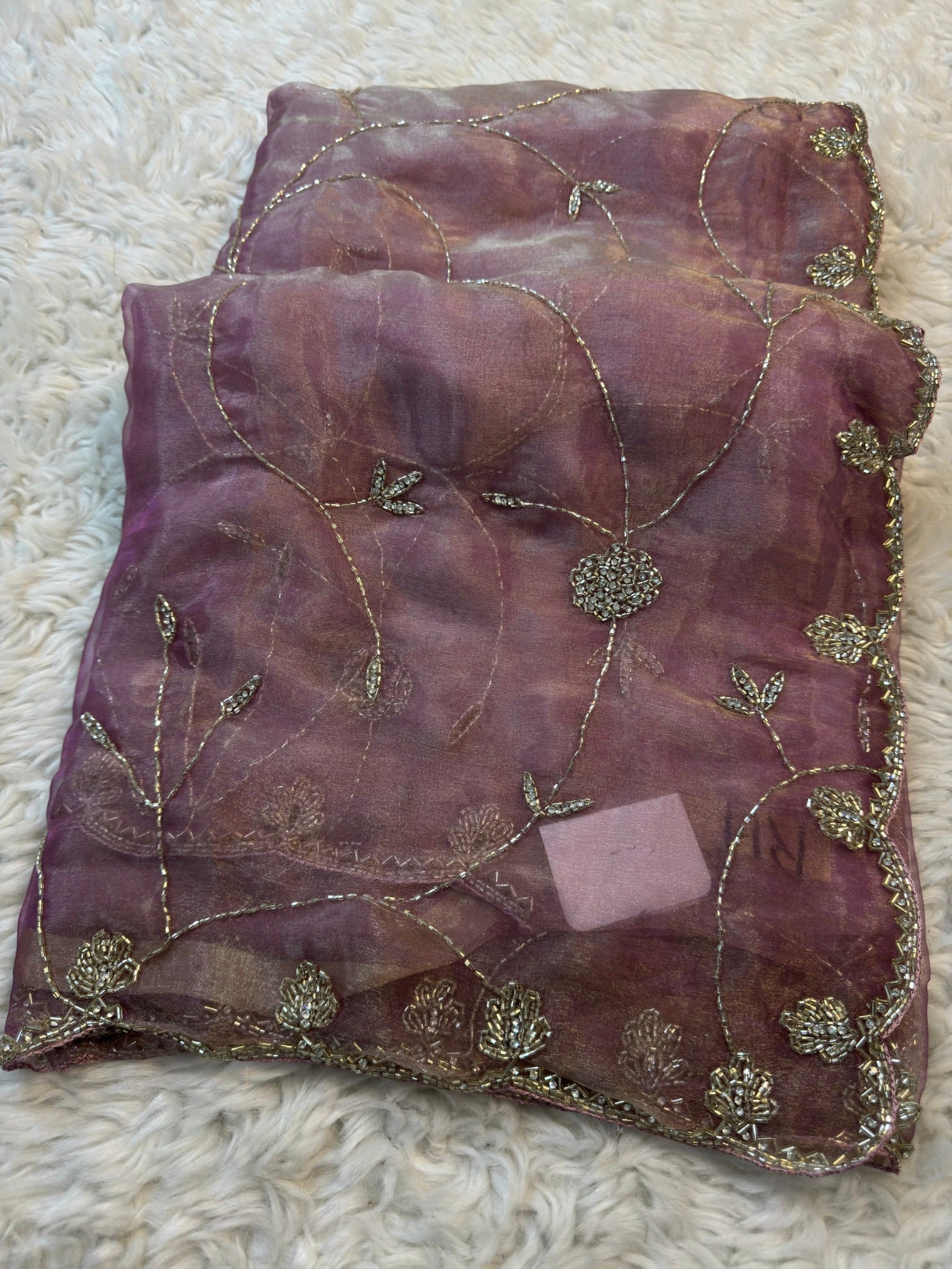 Dolchi Tissue Saree with Floral Hand Embroidery & Designer Border