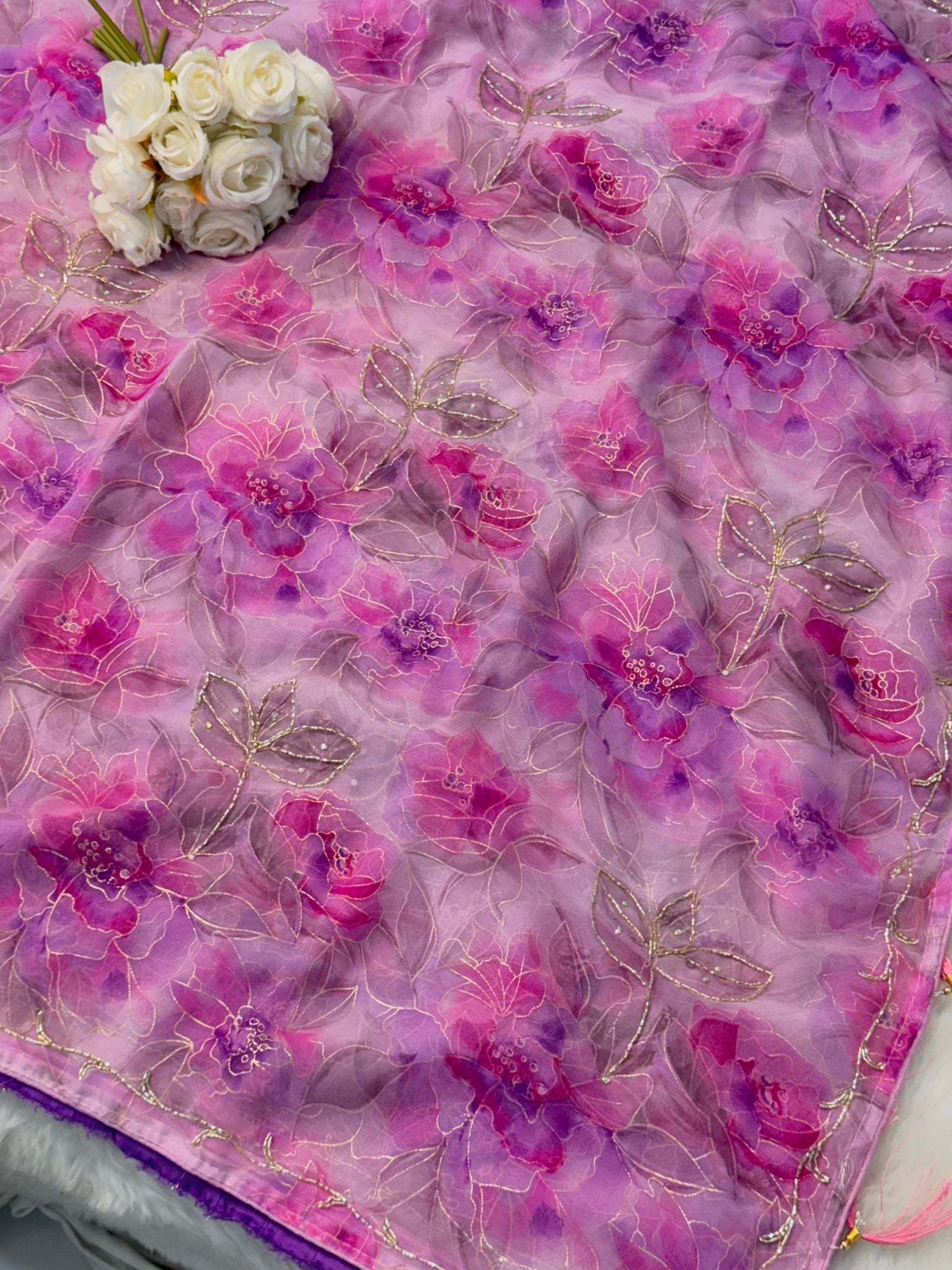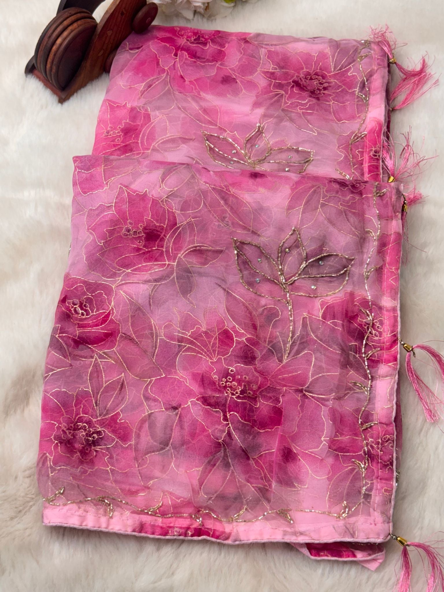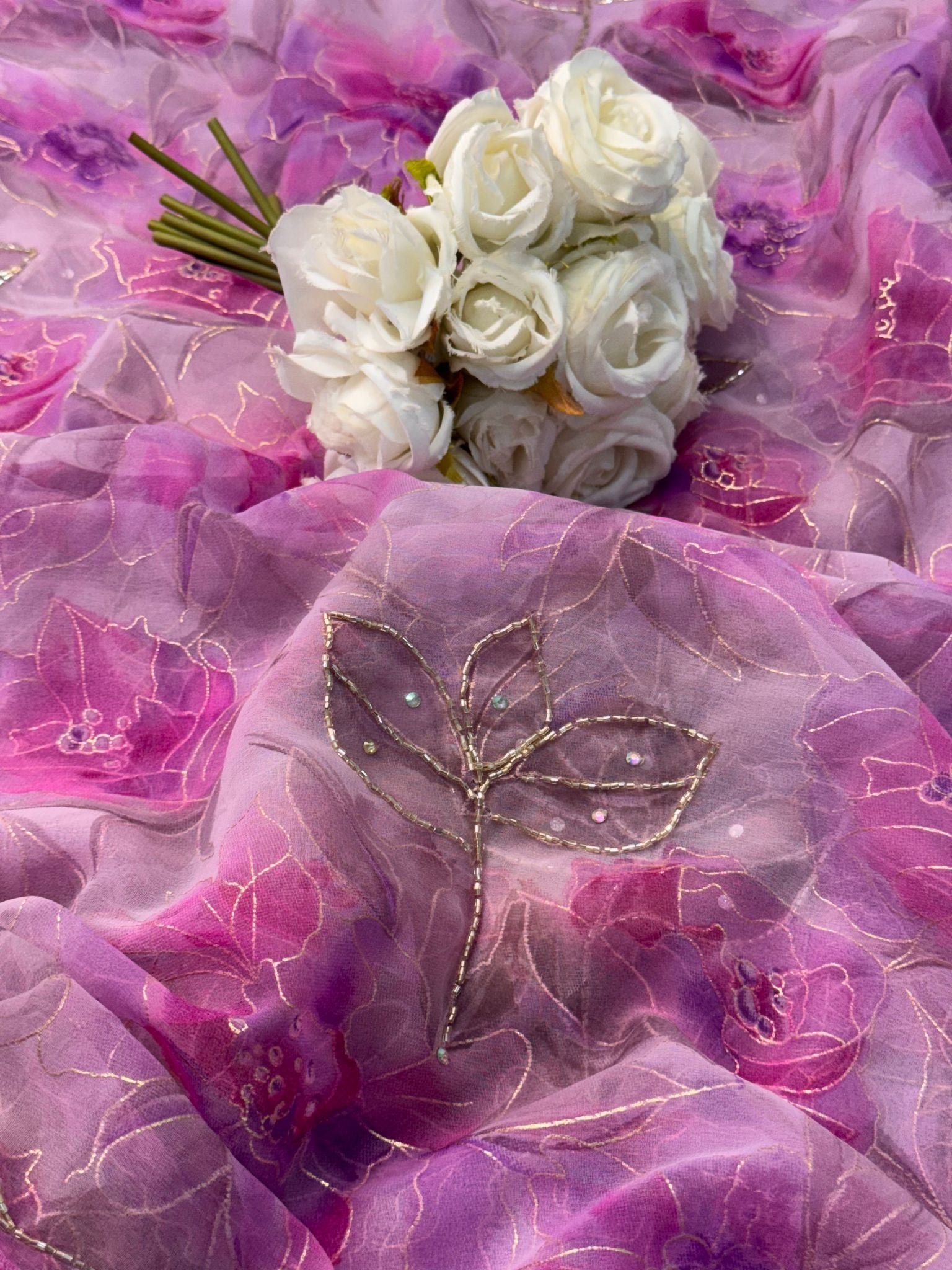 🌸 A masterpiece of craftsmanship – this saree features all-over jaal print intricately highlighted with handworked cutdana embroidery.