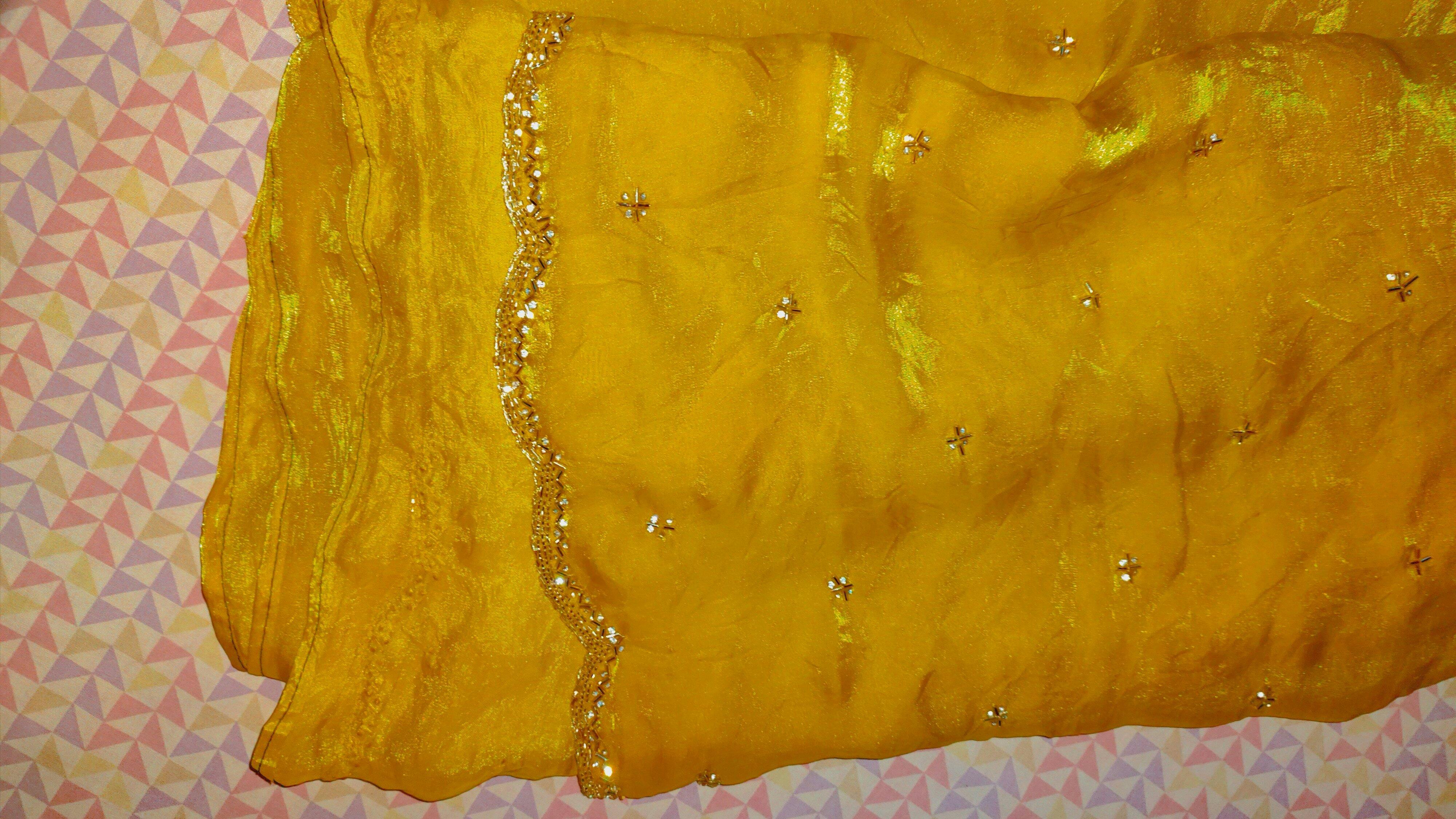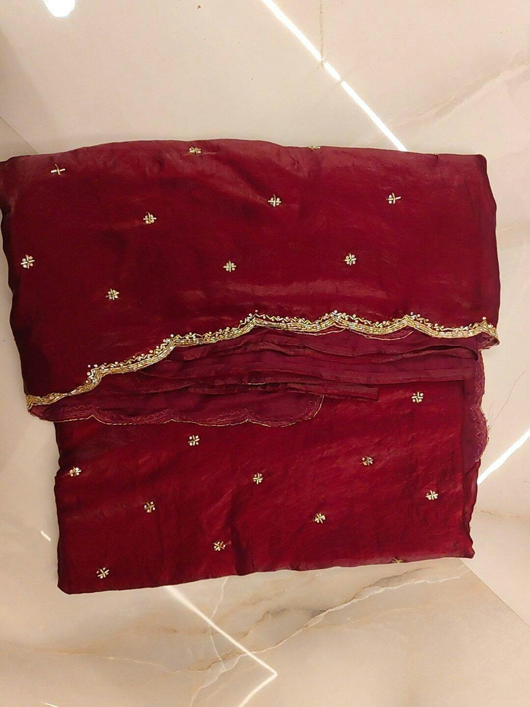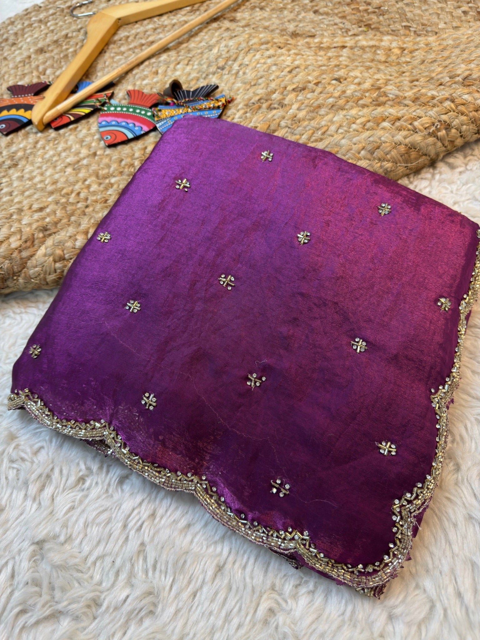 Introducing our Premium Fendy Silk Handwork Saree, crafted in a luxurious glossy finish and adorned with all-over mini mirror butti embroidery. The saree features a beautifully hand-embellished scallop border, making it an elegant choice for weddings, festive occasions & premium celebrations.