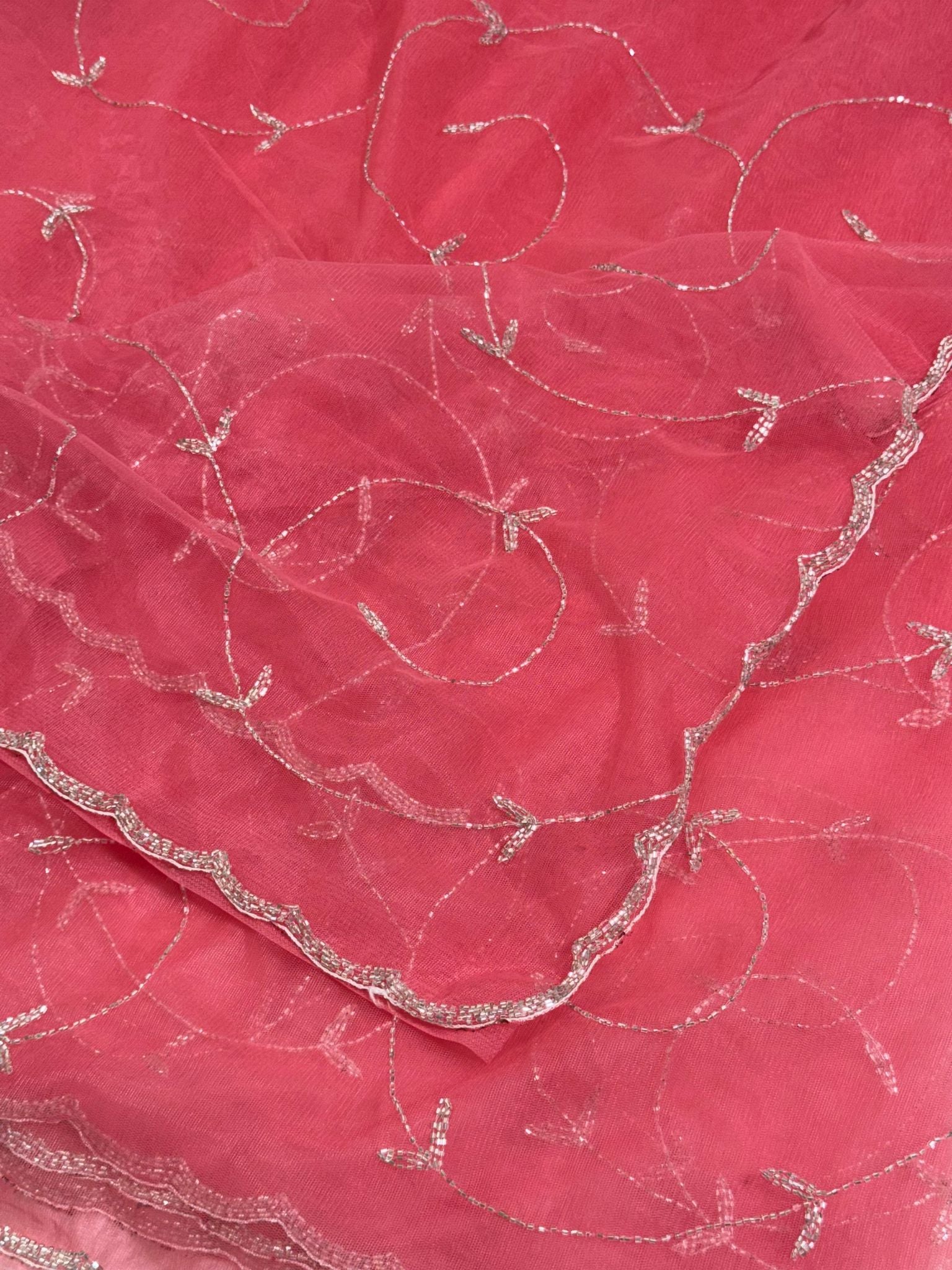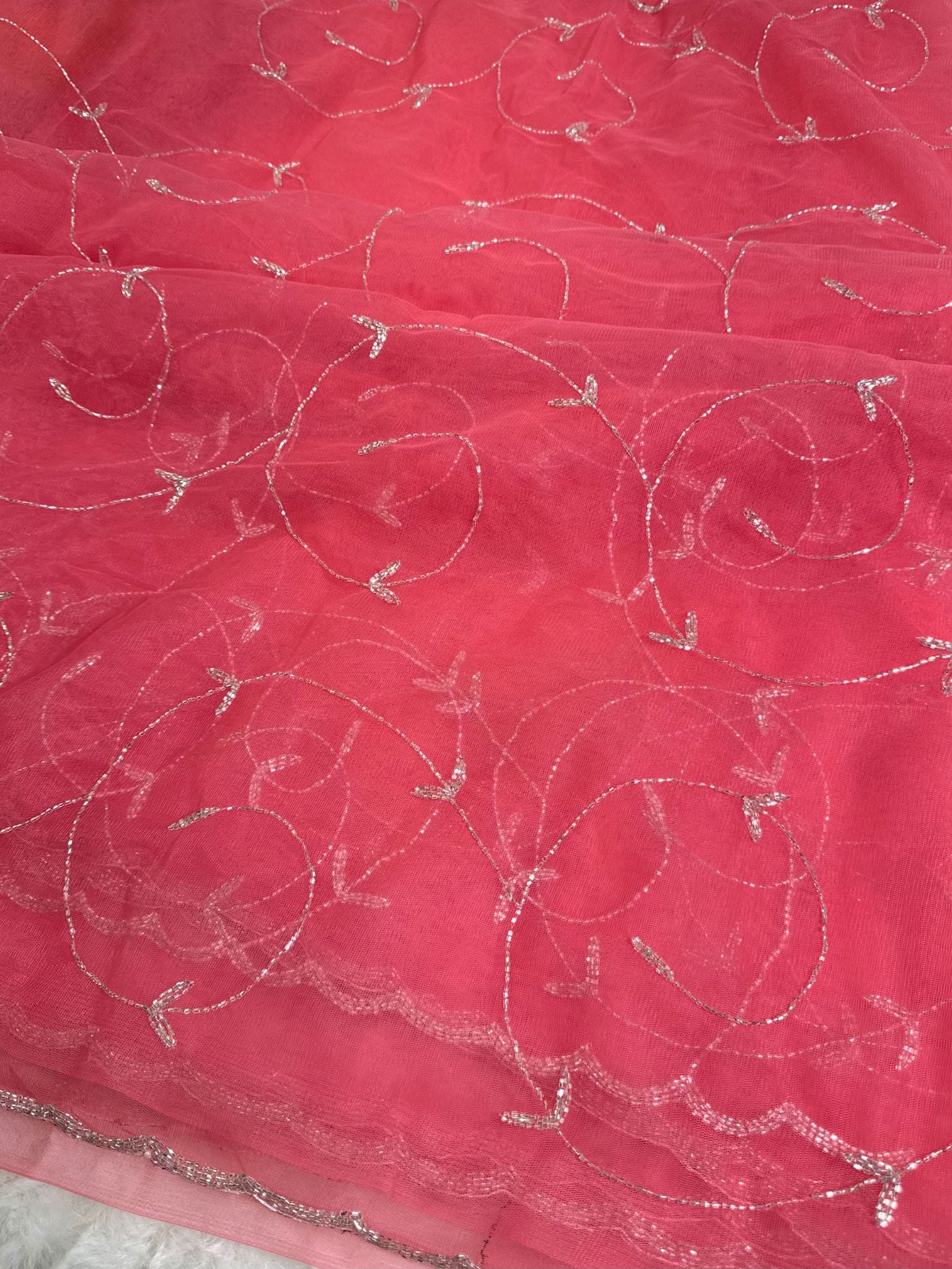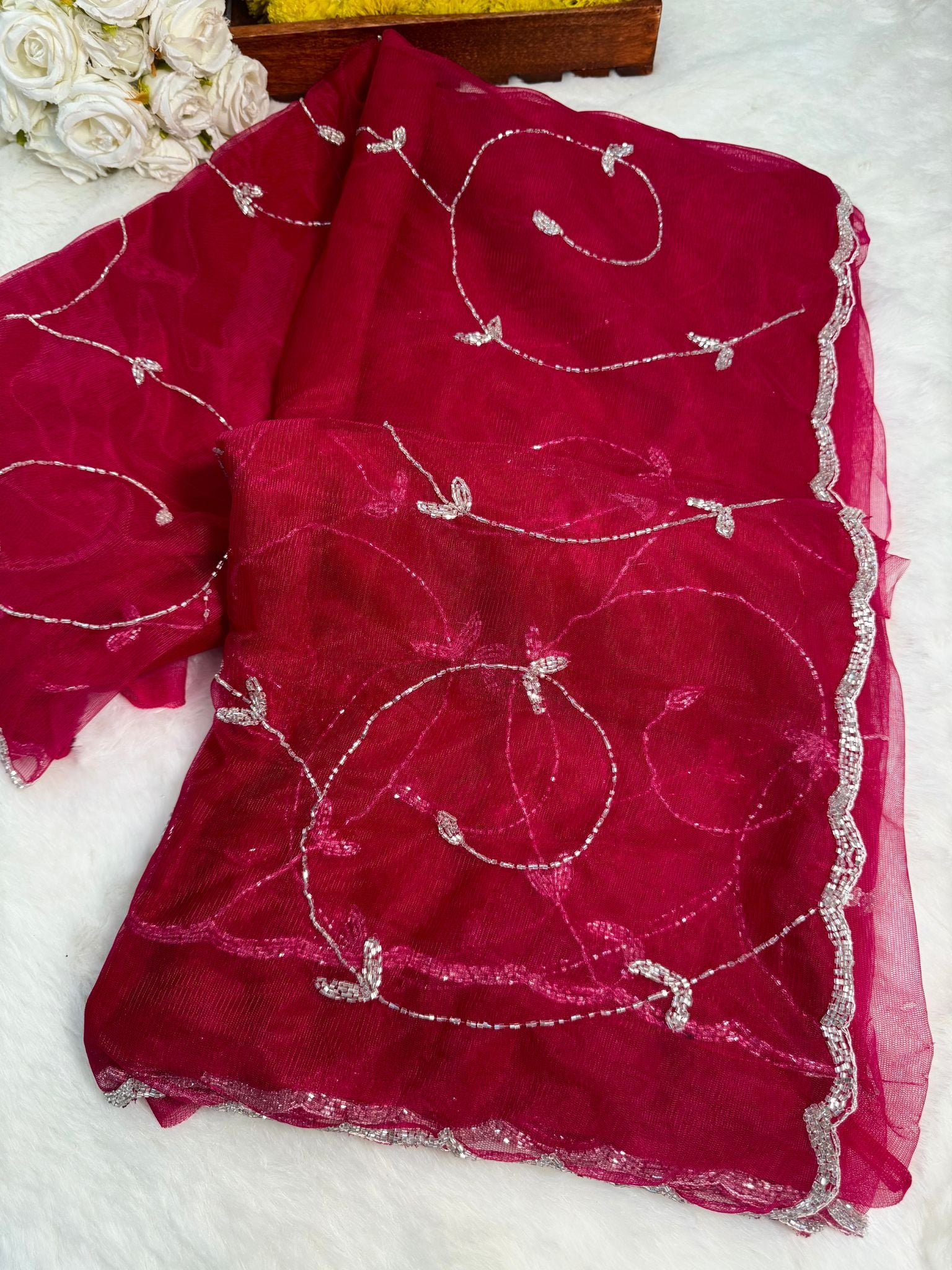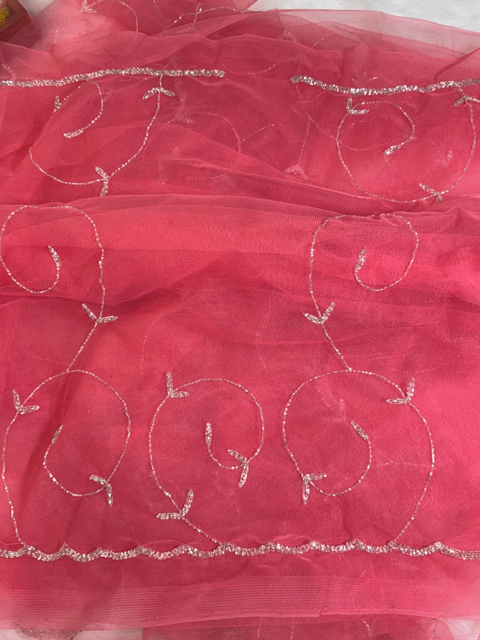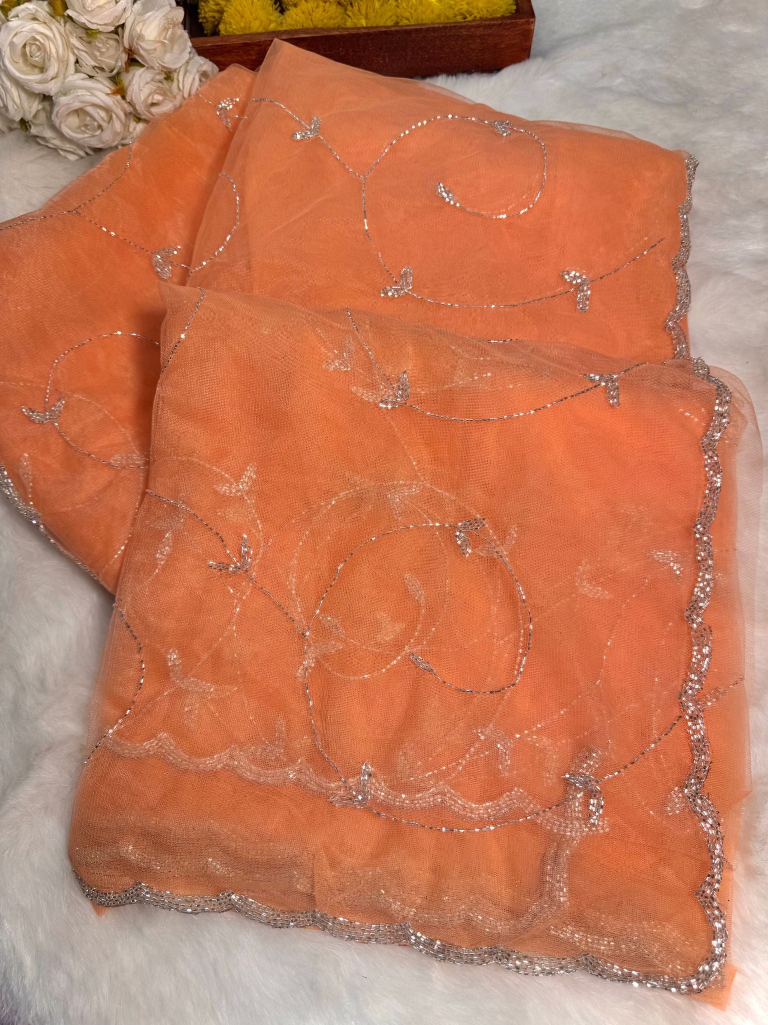 Add a touch of grace to your wardrobe with this elegant net saree featuring delicate cutdana handwork. Lightweight, sheer, and effortlessly stylish — this saree is perfect for festive gatherings, cocktail events, and modern ethnic styling.