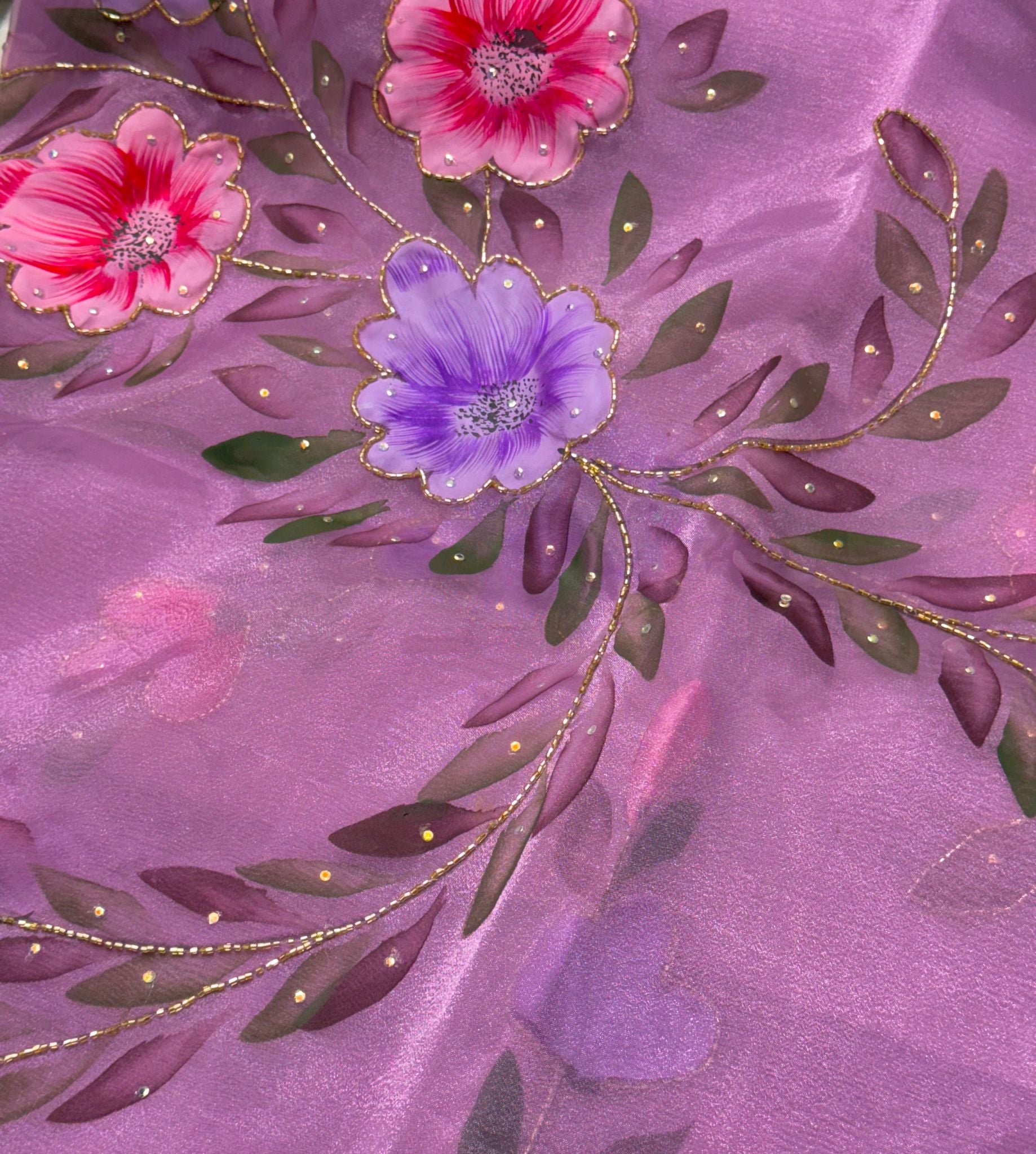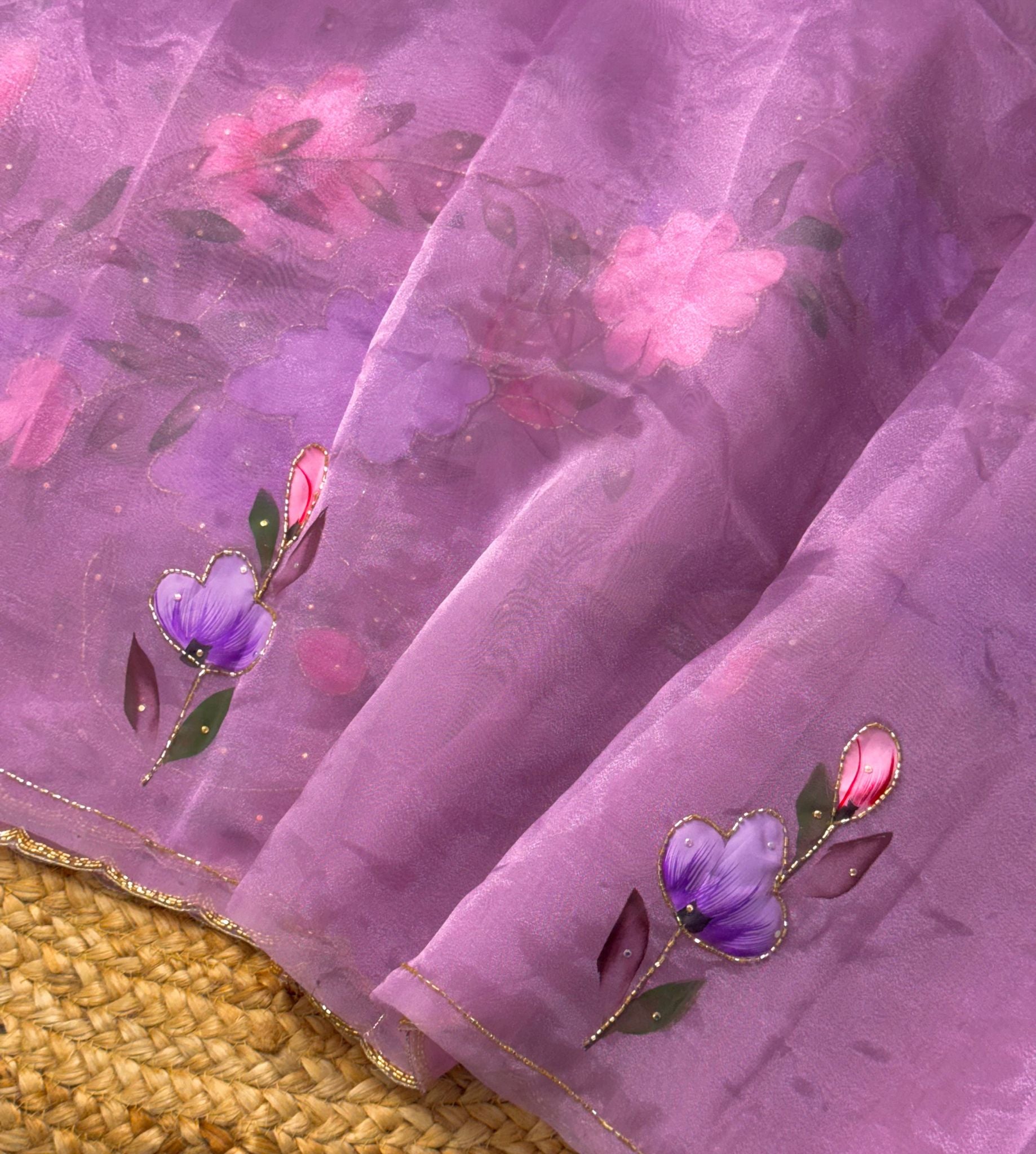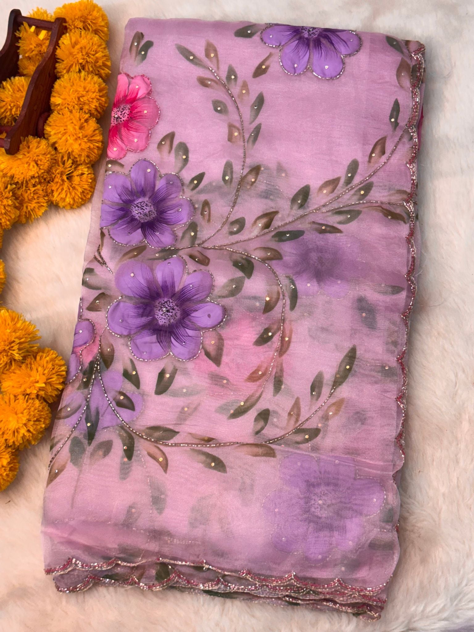 Hand-Painted Floral Organza Saree with Delicate Zari Edging