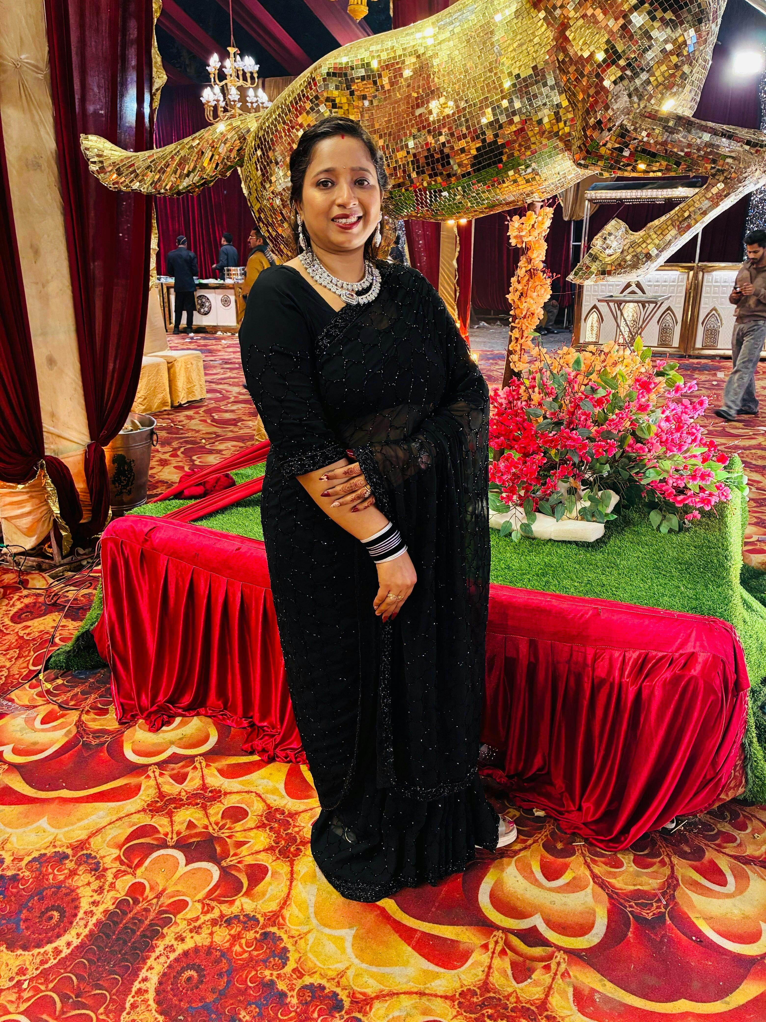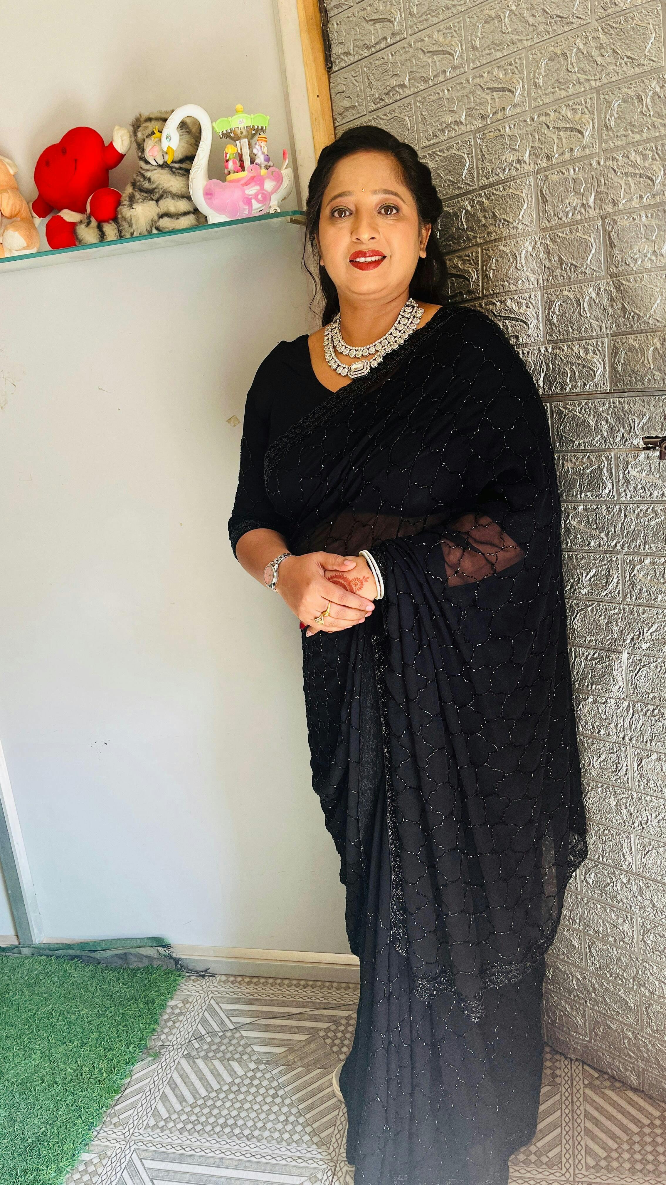 Turn heads with this bestselling classic black georgette saree, intricately hand-embellished with cutdana detailing in a geometric jaal design. The border is beautifully finished with floral handwork, making it a timeless pick for parties, festive nights, and elegant gatherings.