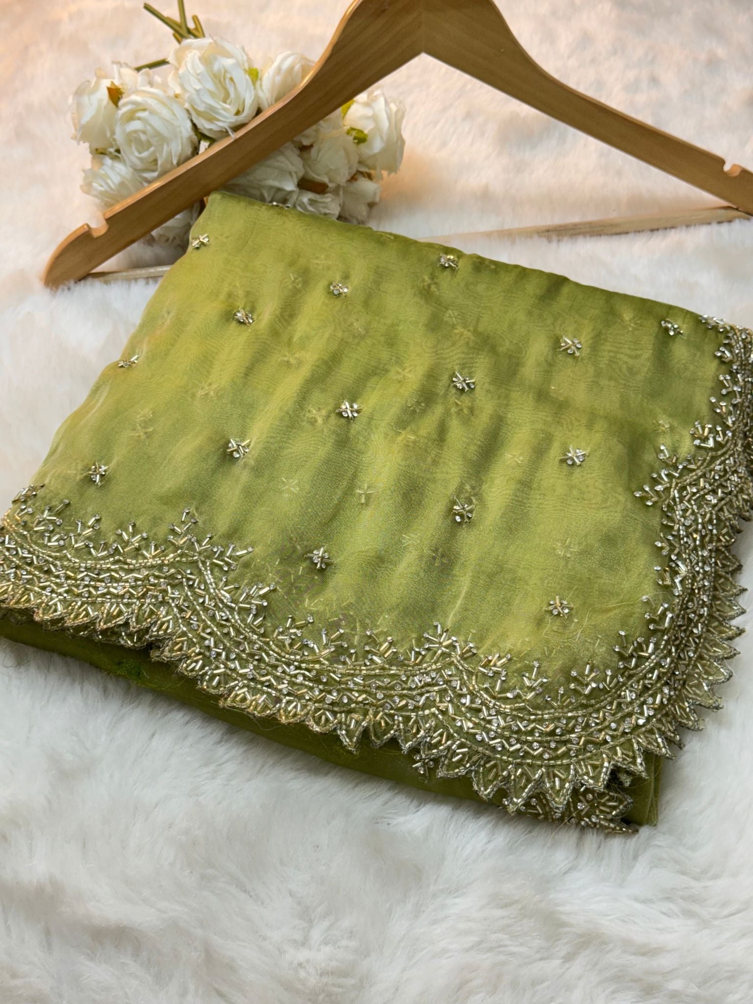 Crafted in premium Dolchi Mausam Tissue fabric, these sarees feature a soft shimmer base with delicate scattered sequin motifs and an intricately detailed cutdana scalloped border. The luxurious texture gives a festive glow, making it perfect for weddings, receptions, and festive occasions.