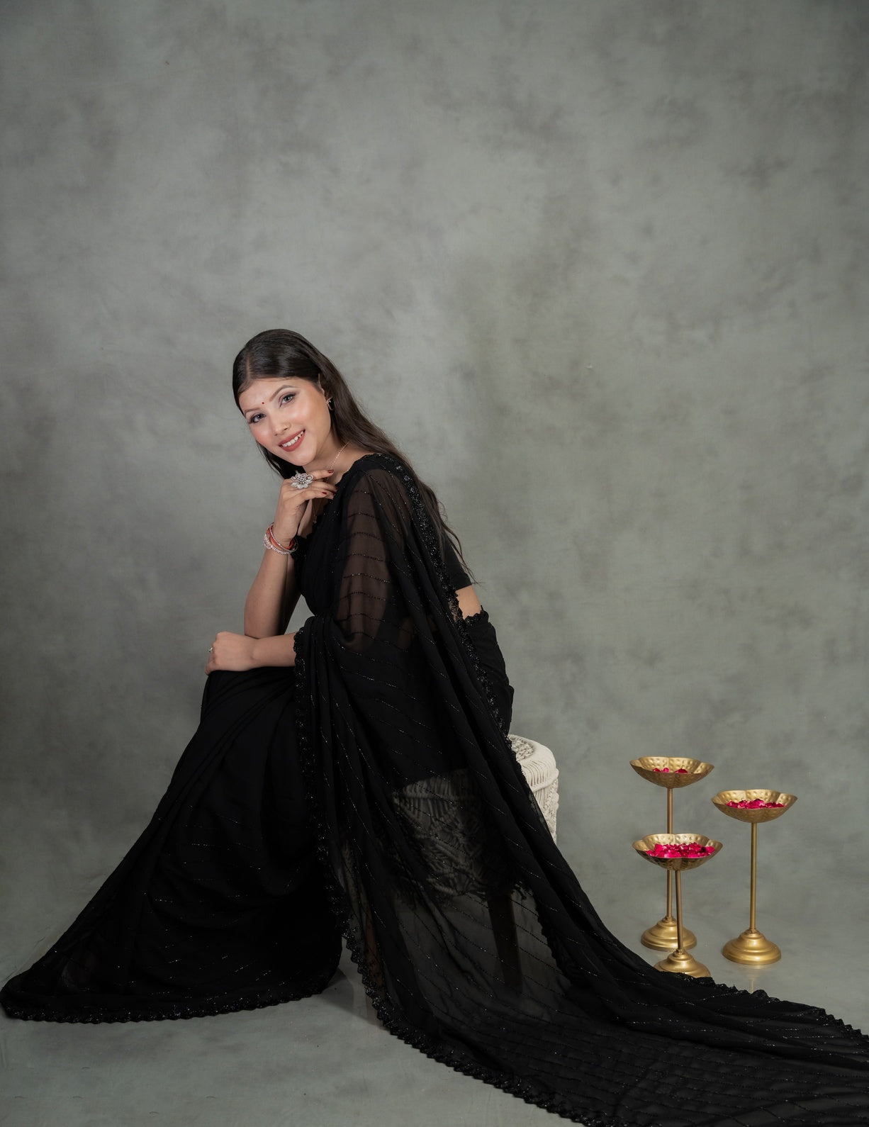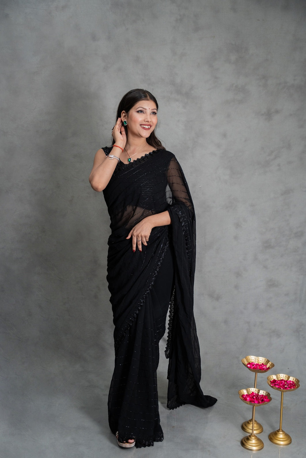 A classic in every way, this midnight black georgette saree features elegant horizontal cutdana handwork lines across the drape, creating a sleek and refined texture. The intricately finished scalloped border with leafy cutdana detailing adds a rich, handcrafted charm. Lightweight yet luxurious, this saree is ideal for evening parties, formal gatherings, and festive celebrations. Drape this designer black saree to exude effortless glamour