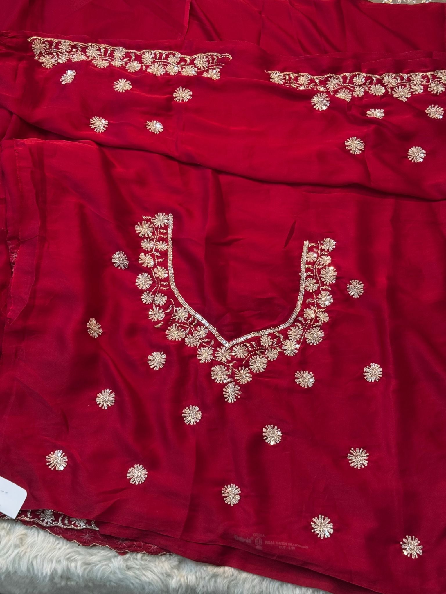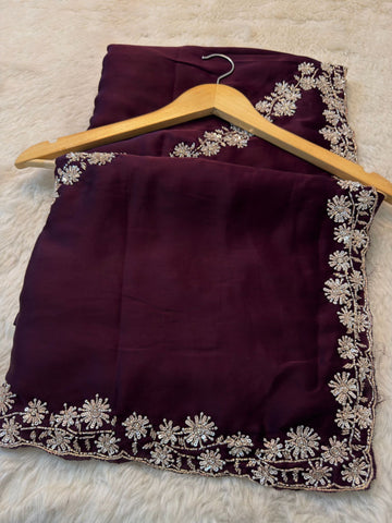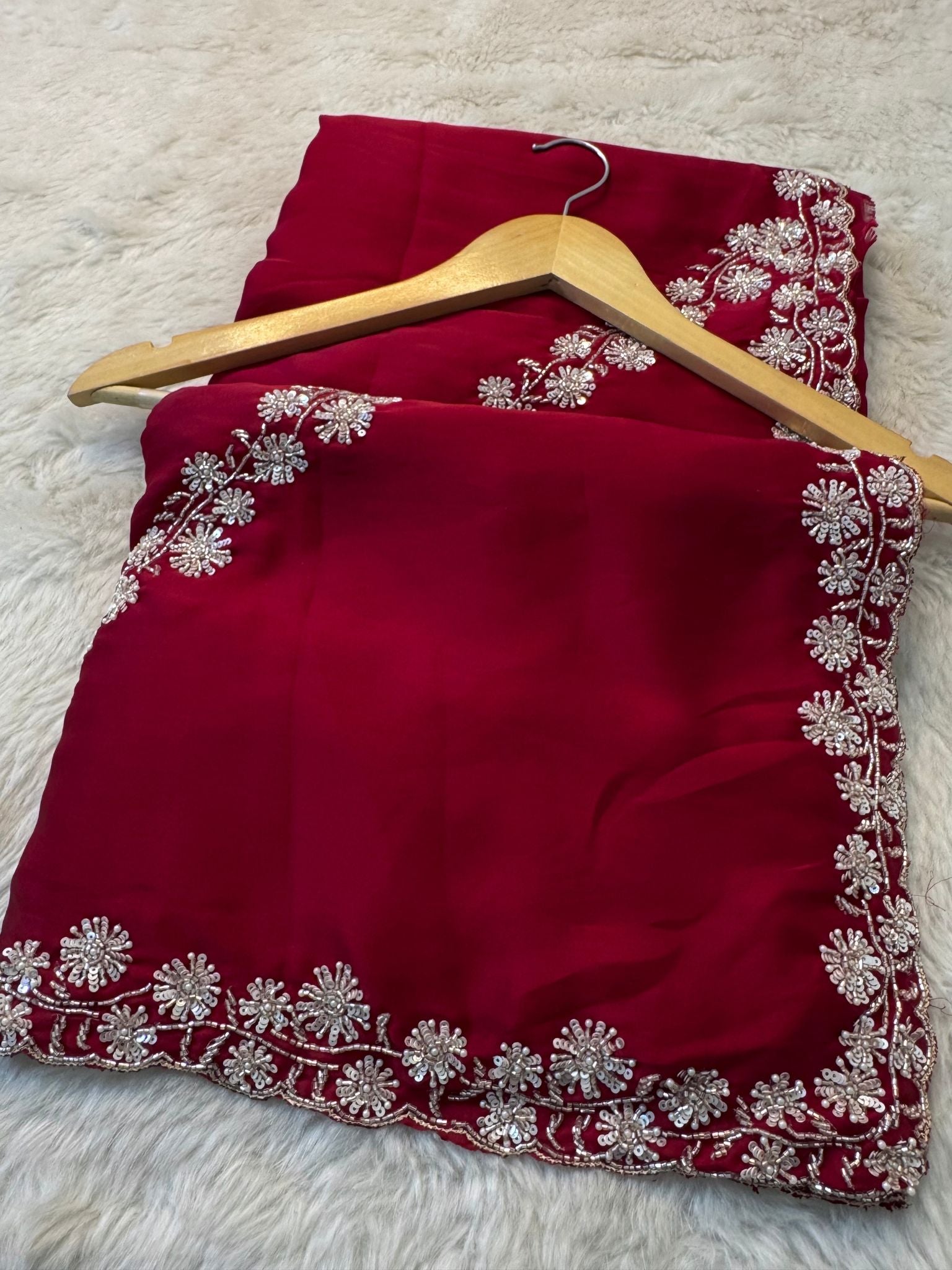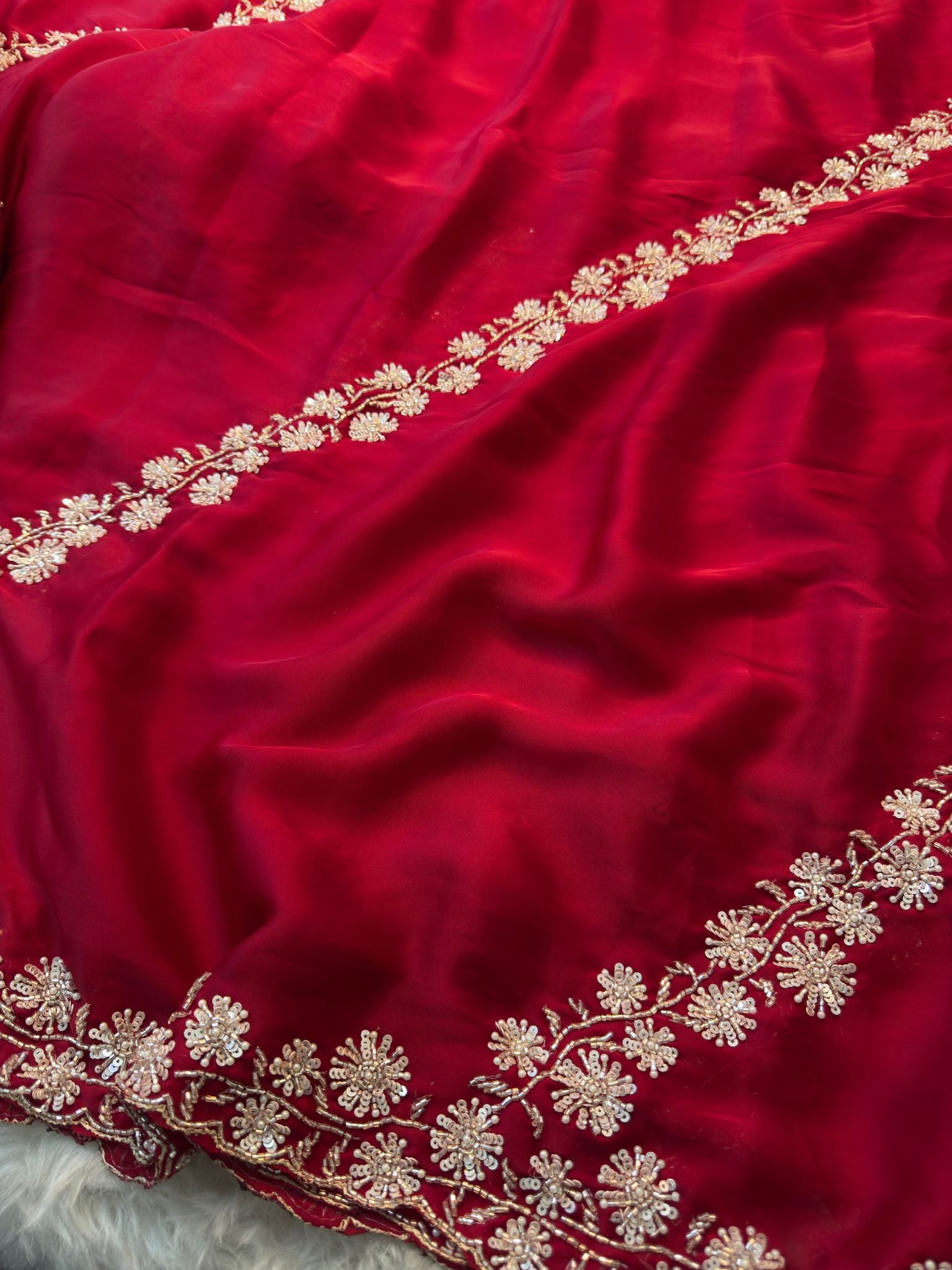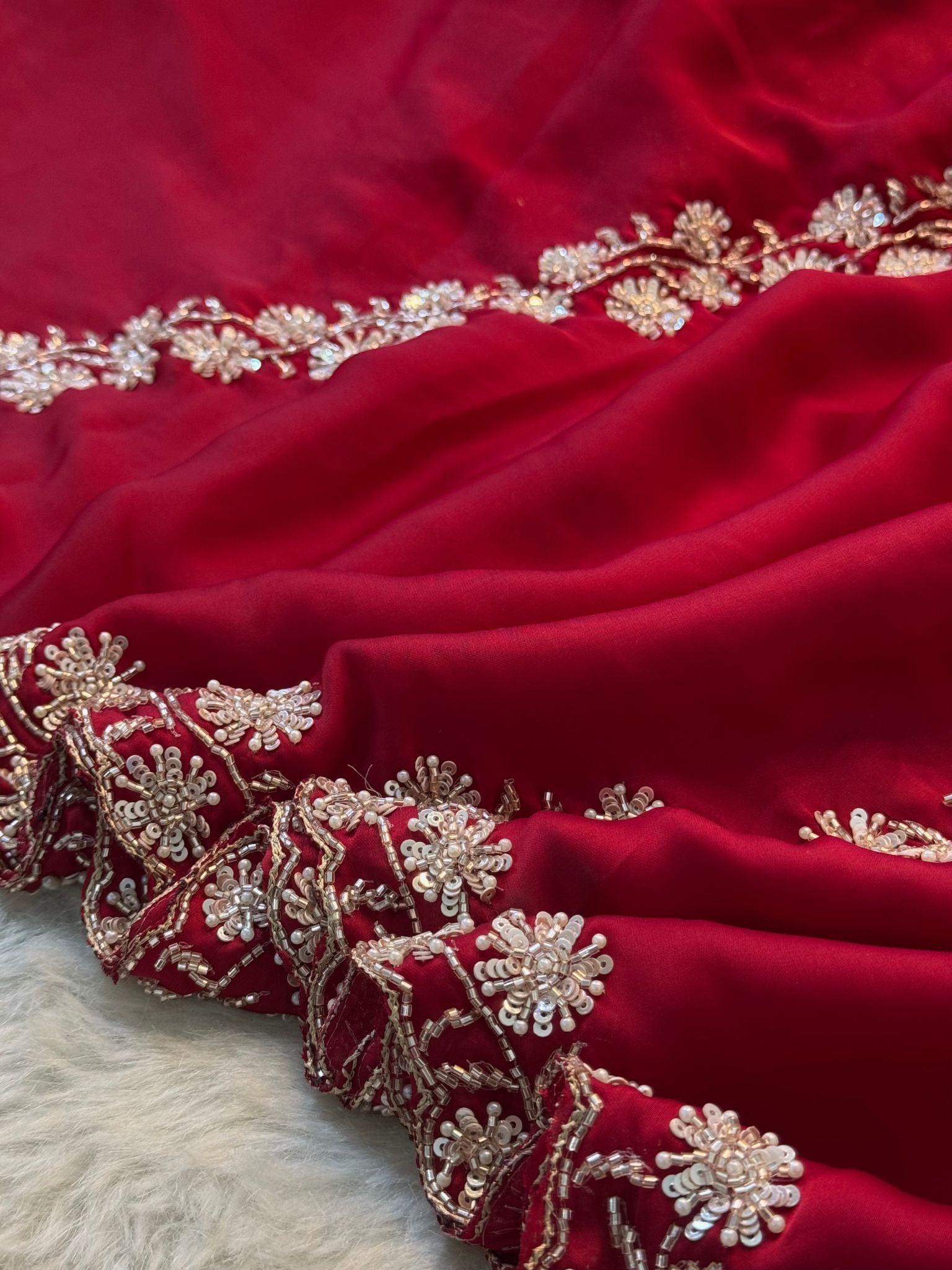 A luxurious Satin Silk Saree featuring an elegant hand-embroidered floral sequin border.