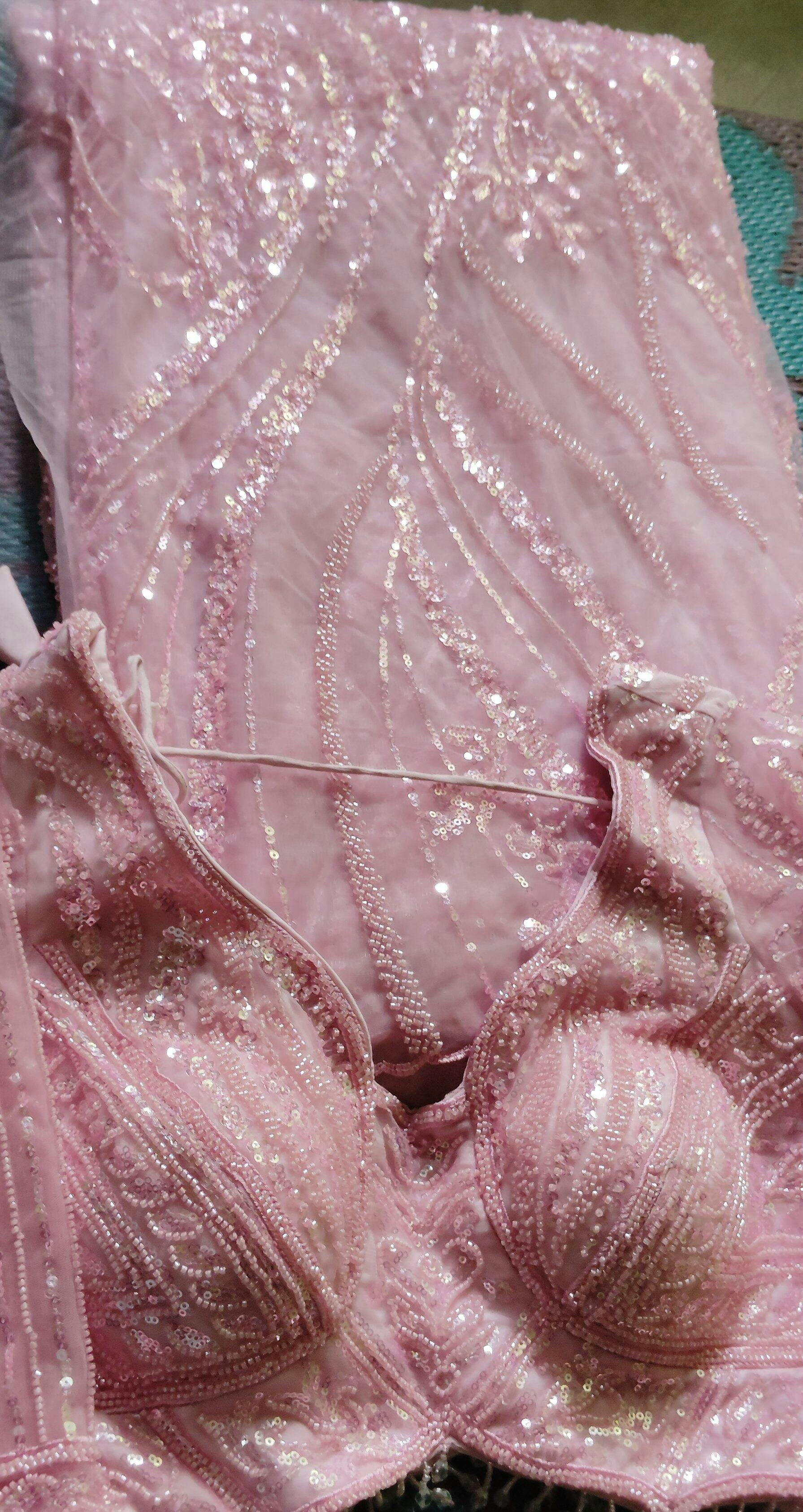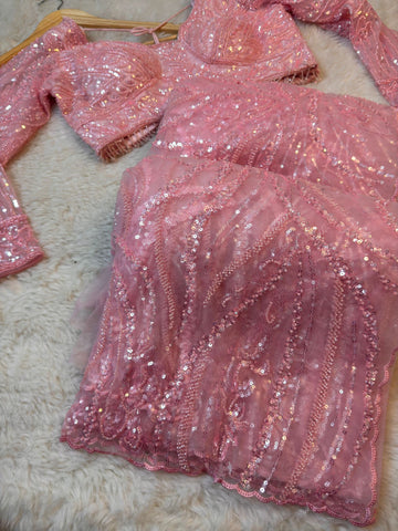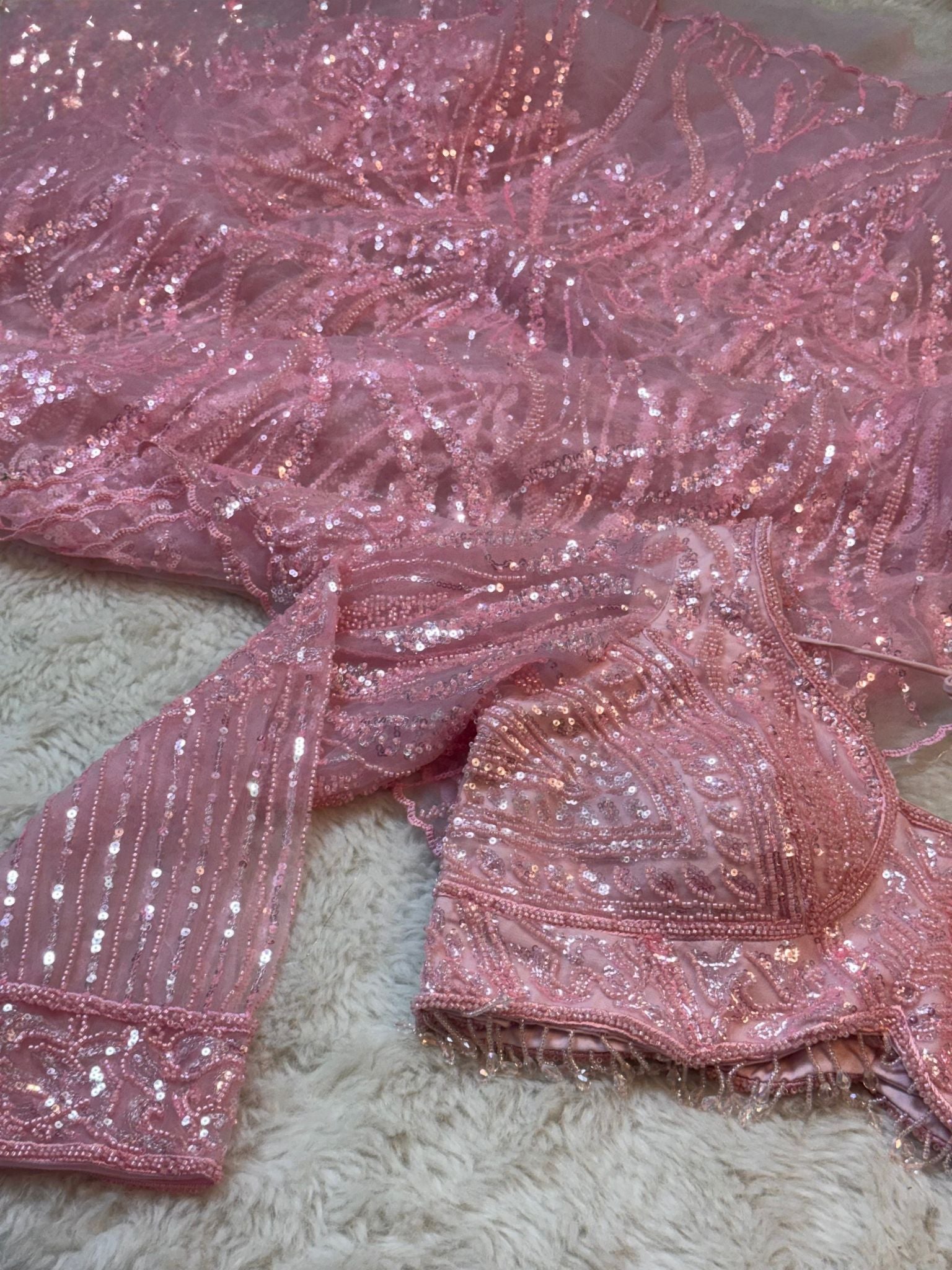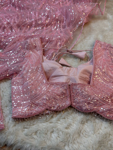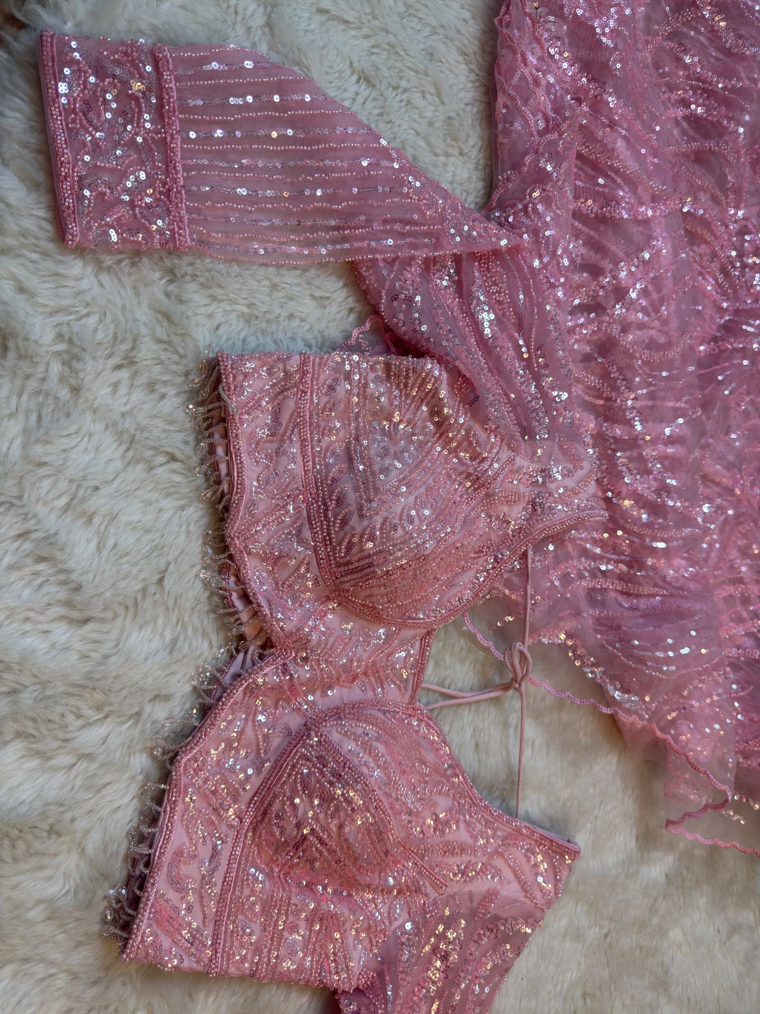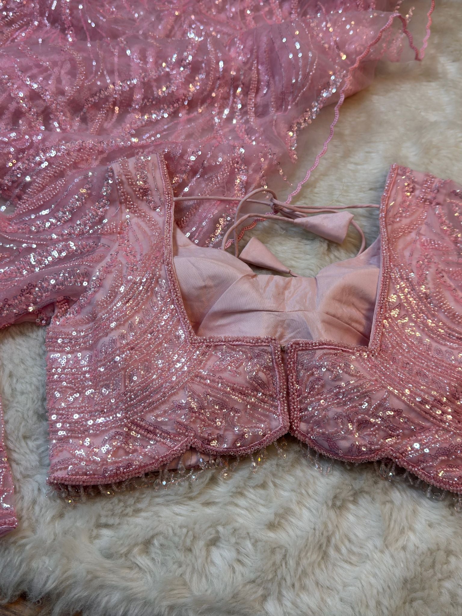 🌸 Blush Pink Sequin Embroidered Net Saree with Stitched Blouse