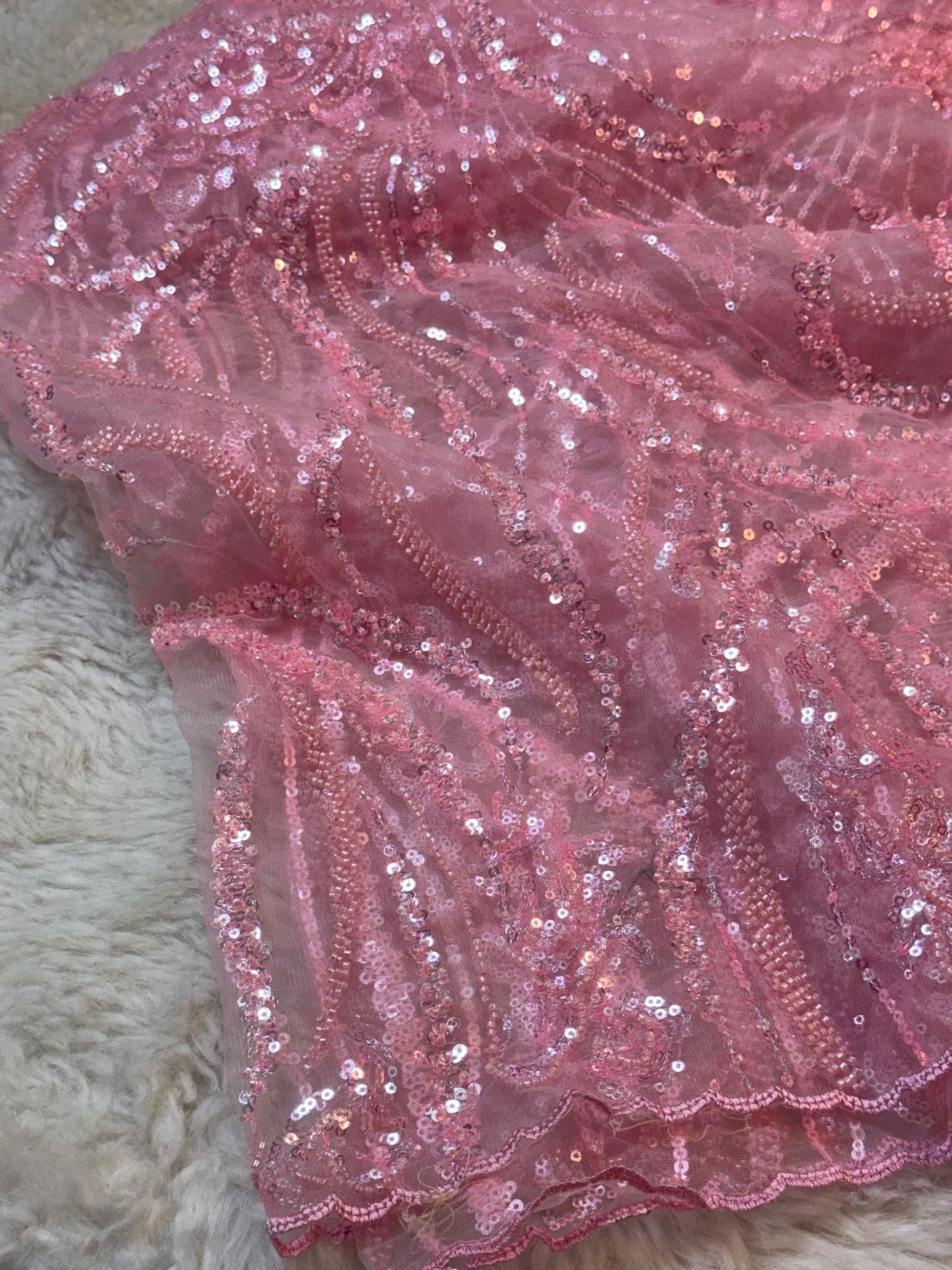 A dreamy blush pink net saree designed to sparkle effortlessly. Featuring all-over sequin embroidery with soft wave patterns and a delicately finished scalloped edge, this saree comes paired with a fully stitched, heavily embroidered blouse for a complete ready-to-wear look.