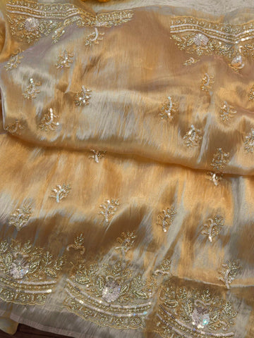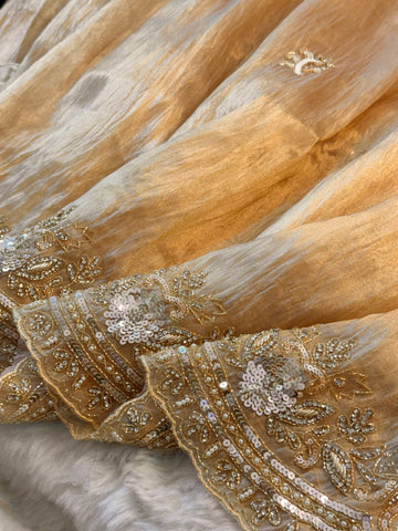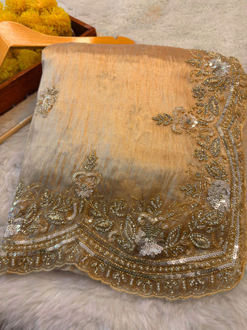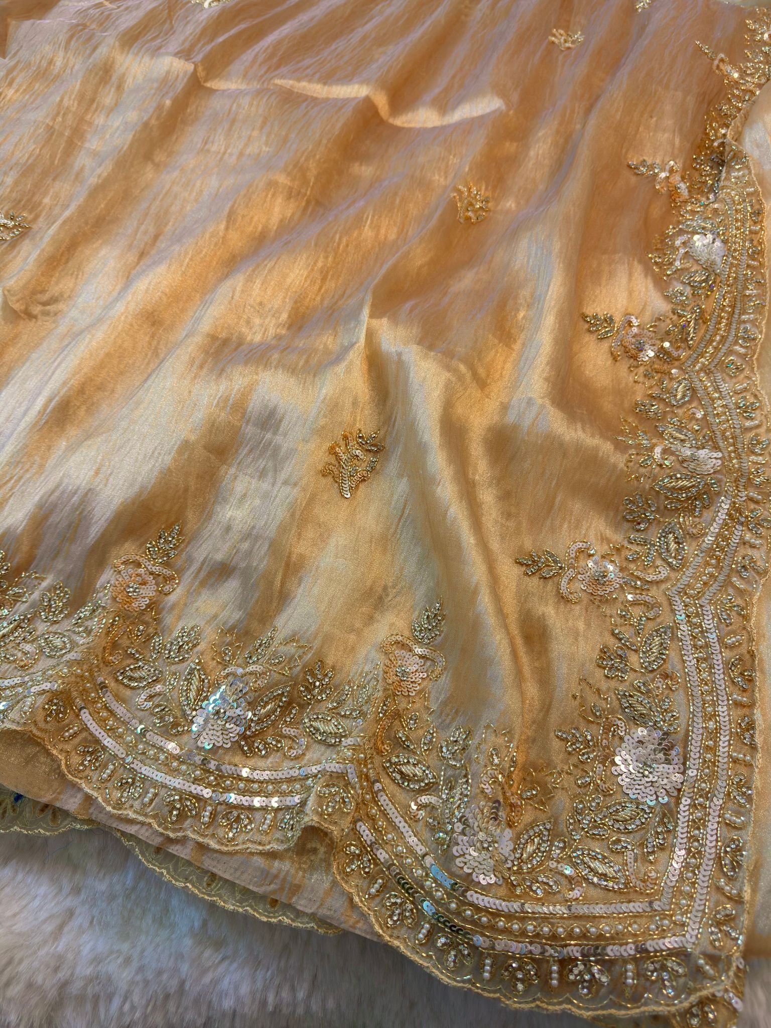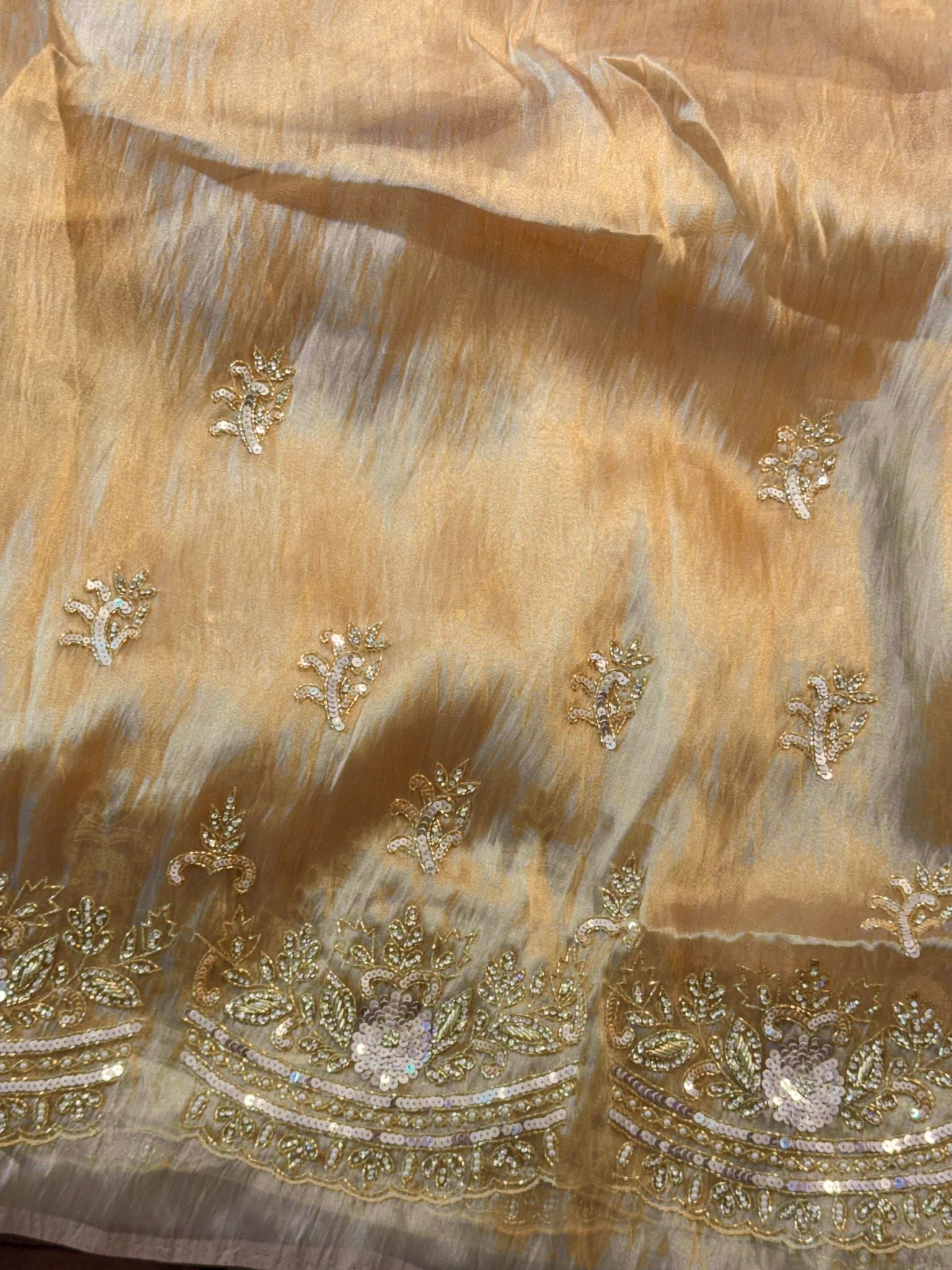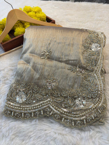 Grace meets grandeur in this Zari Silk Saree, featuring intricate floral sequin embroidery, zari detailing, and bead scalloped border.