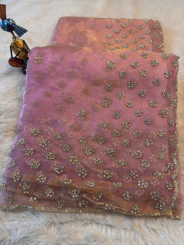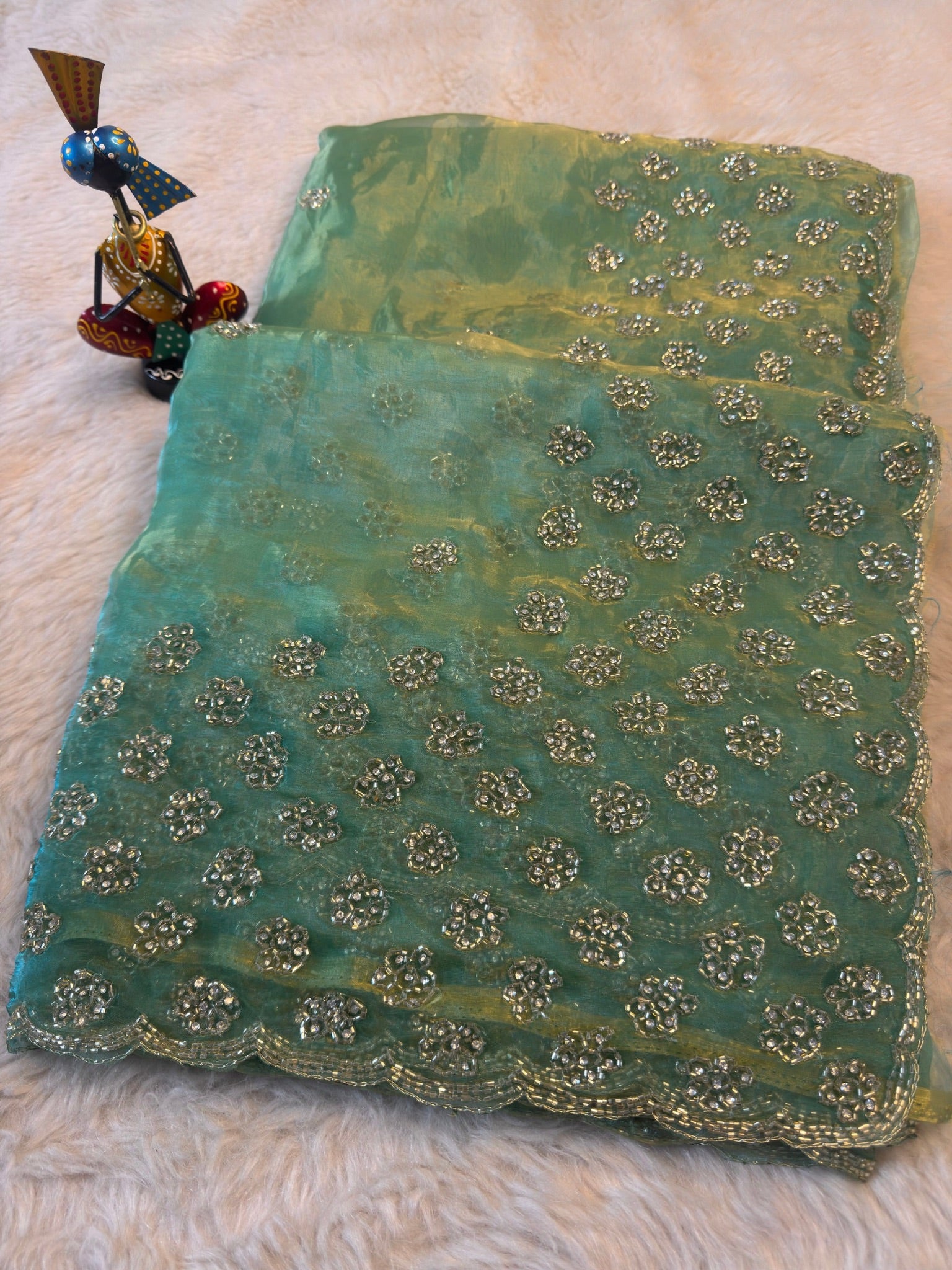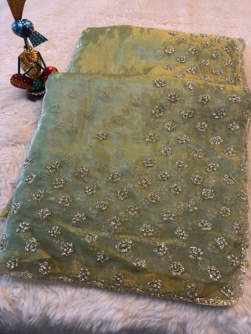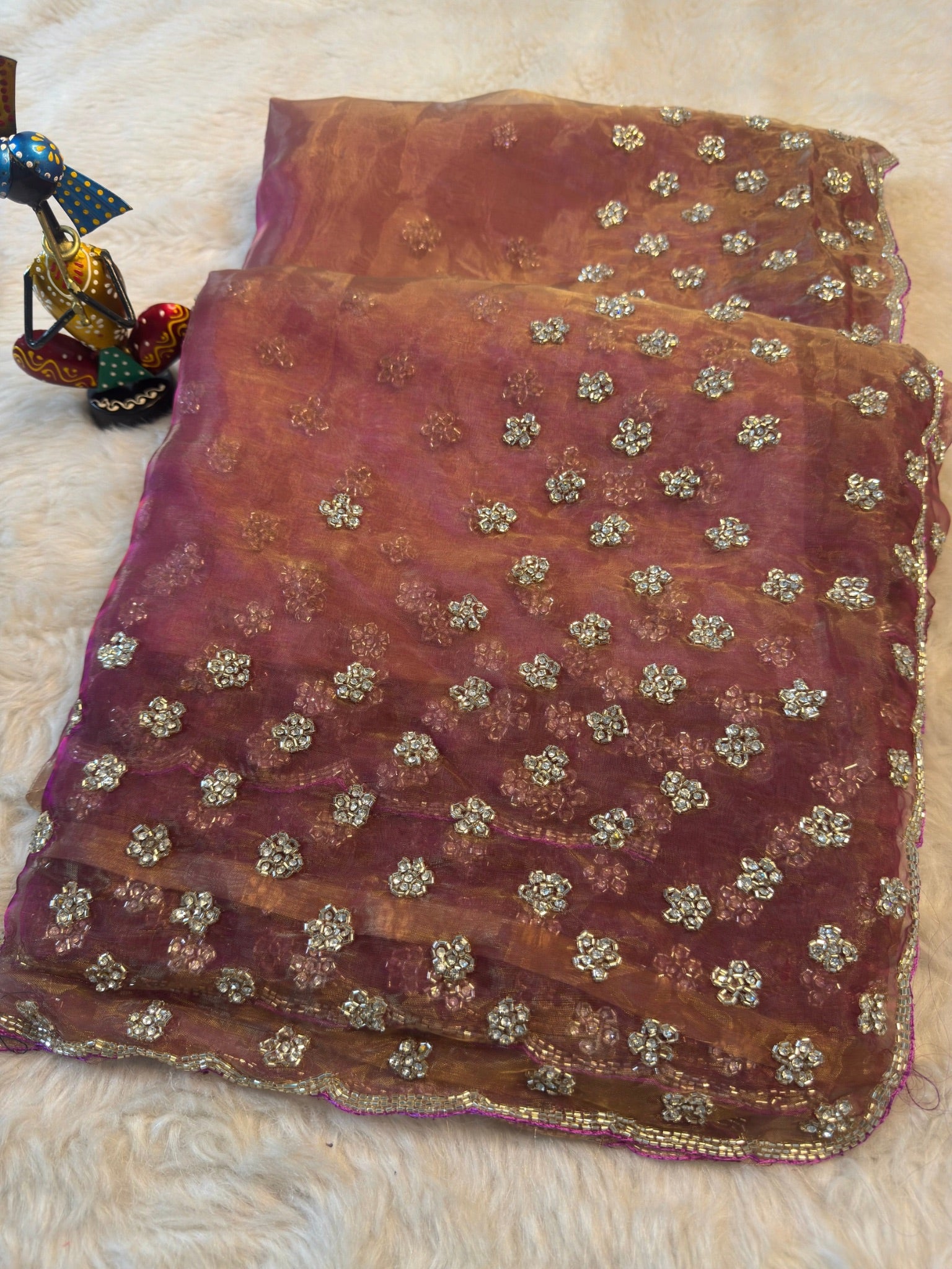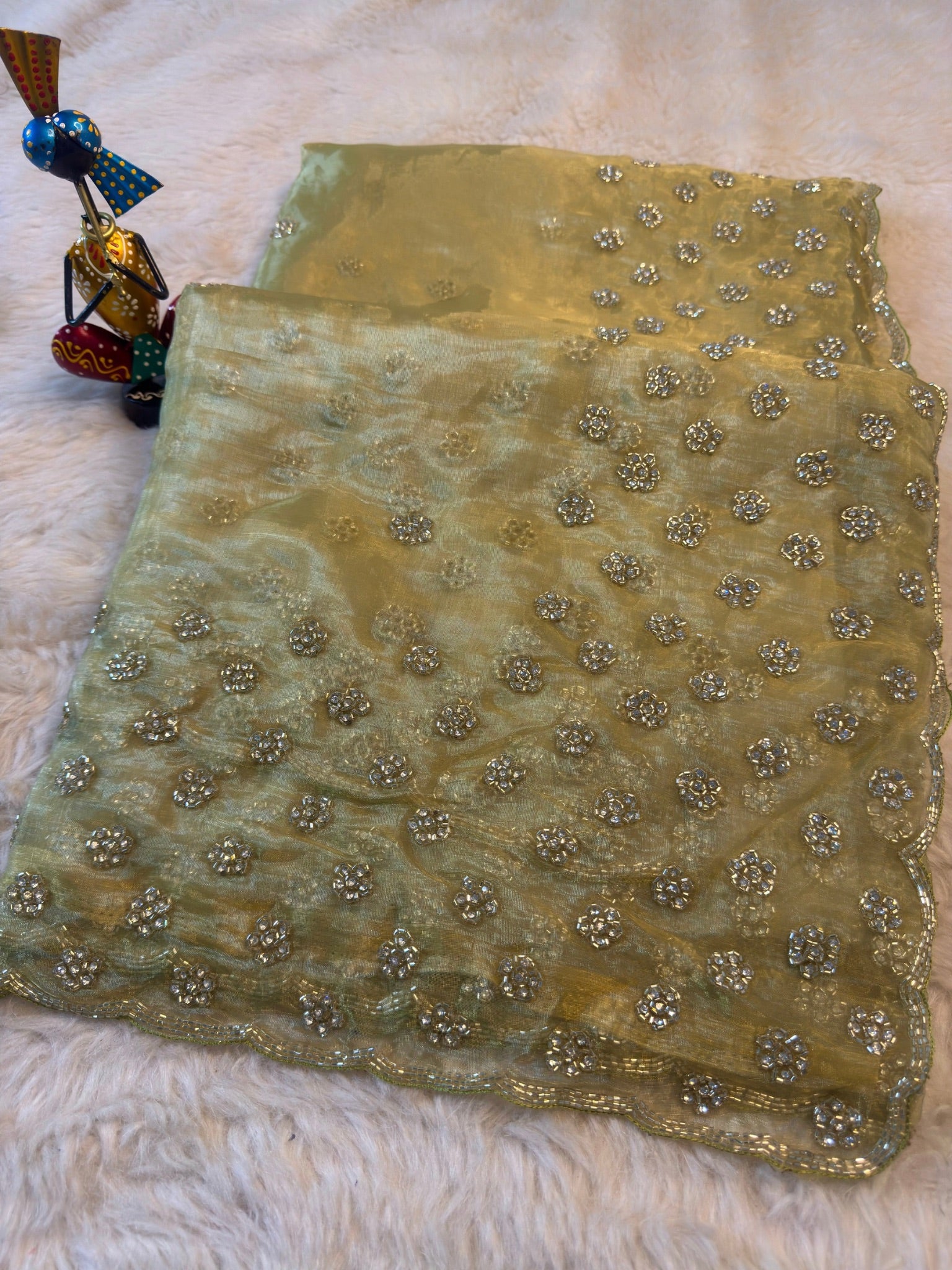 Dolchi Tissue Saree with Crystal Floral Butti & Scalloped Border