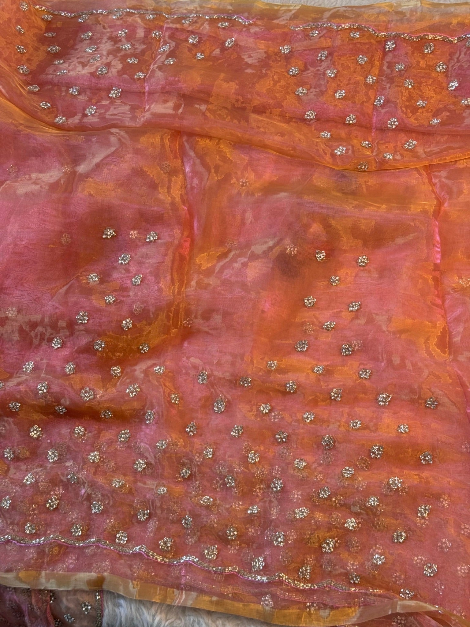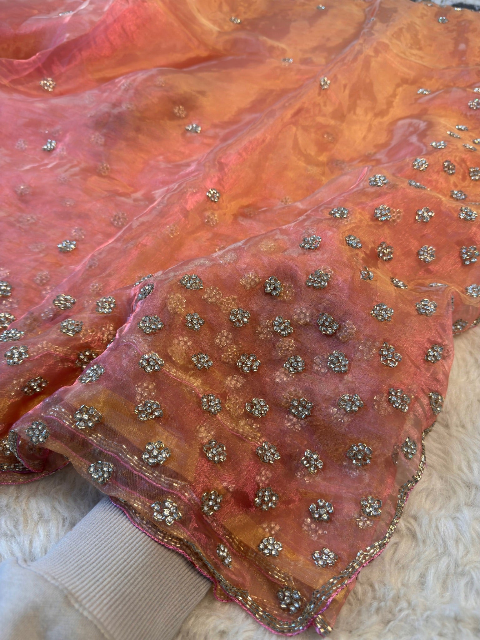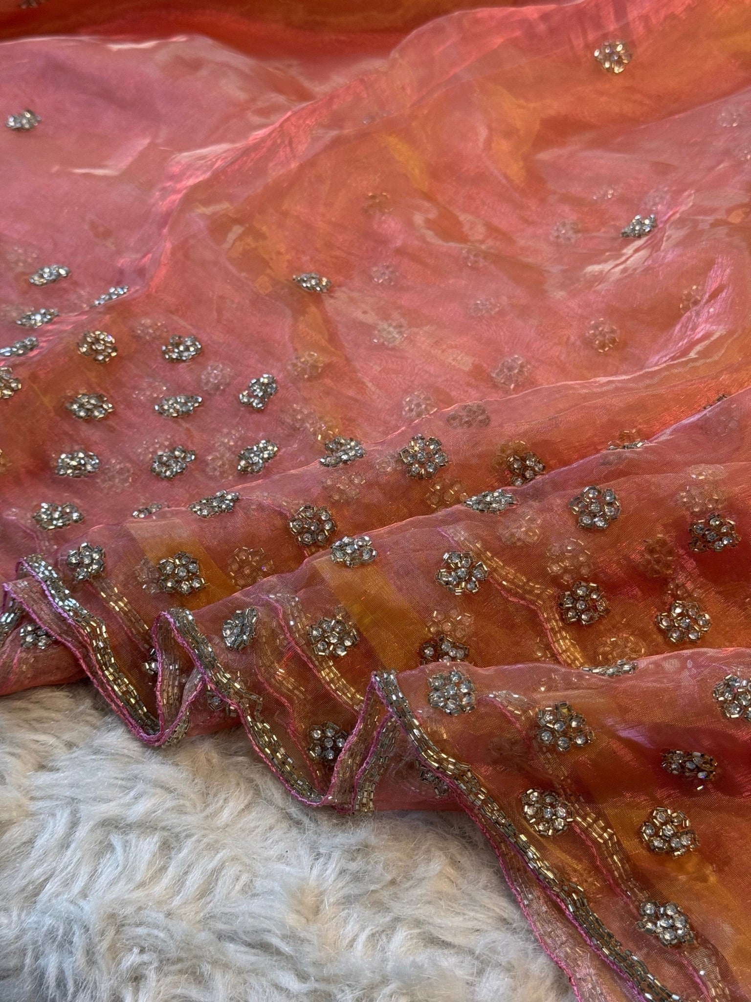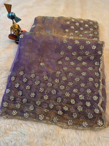 Add effortless elegance to your festive wardrobe with this Dolchi Tissue Saree, featuring all-over crystal floral butti embroidery that sparkles beautifully with every movement. The soft sheen of dolchi tissue paired with a finely crafted scalloped border makes this saree perfect for weddings, festive celebrations, and evening occasions.