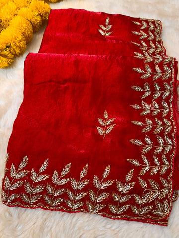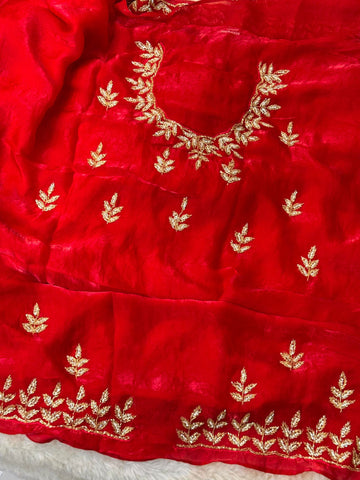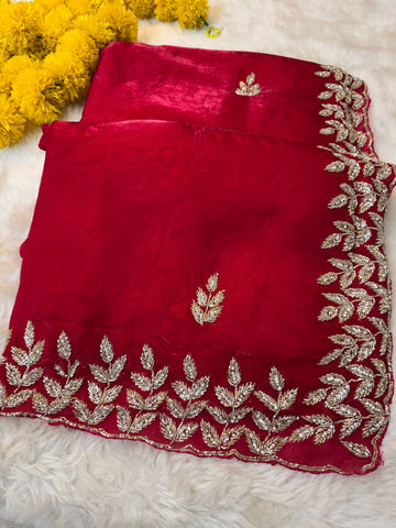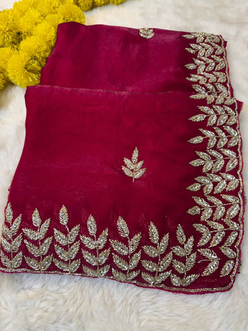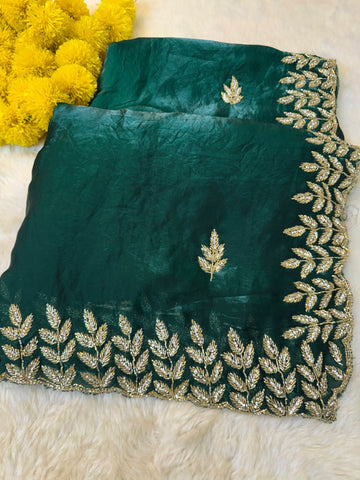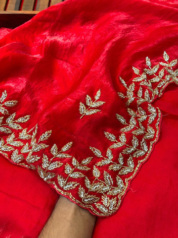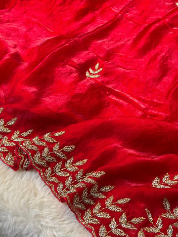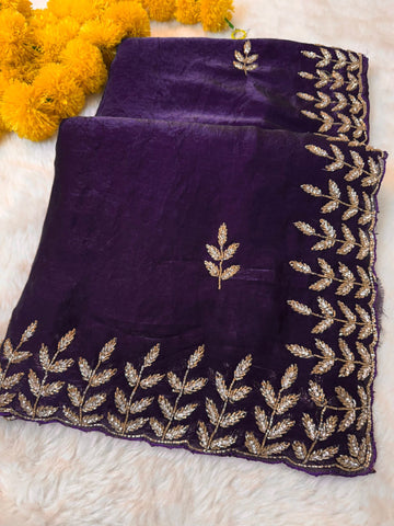 Fendy Silk Saree with Golden Leaf Embroidery & Scalloped Border