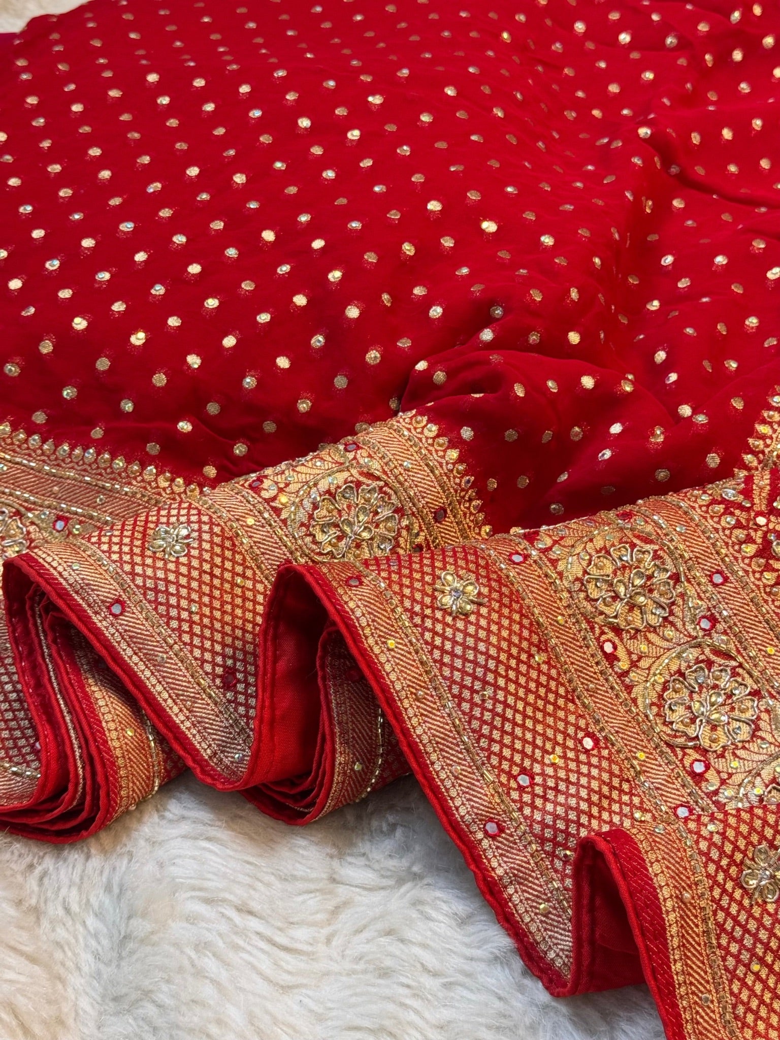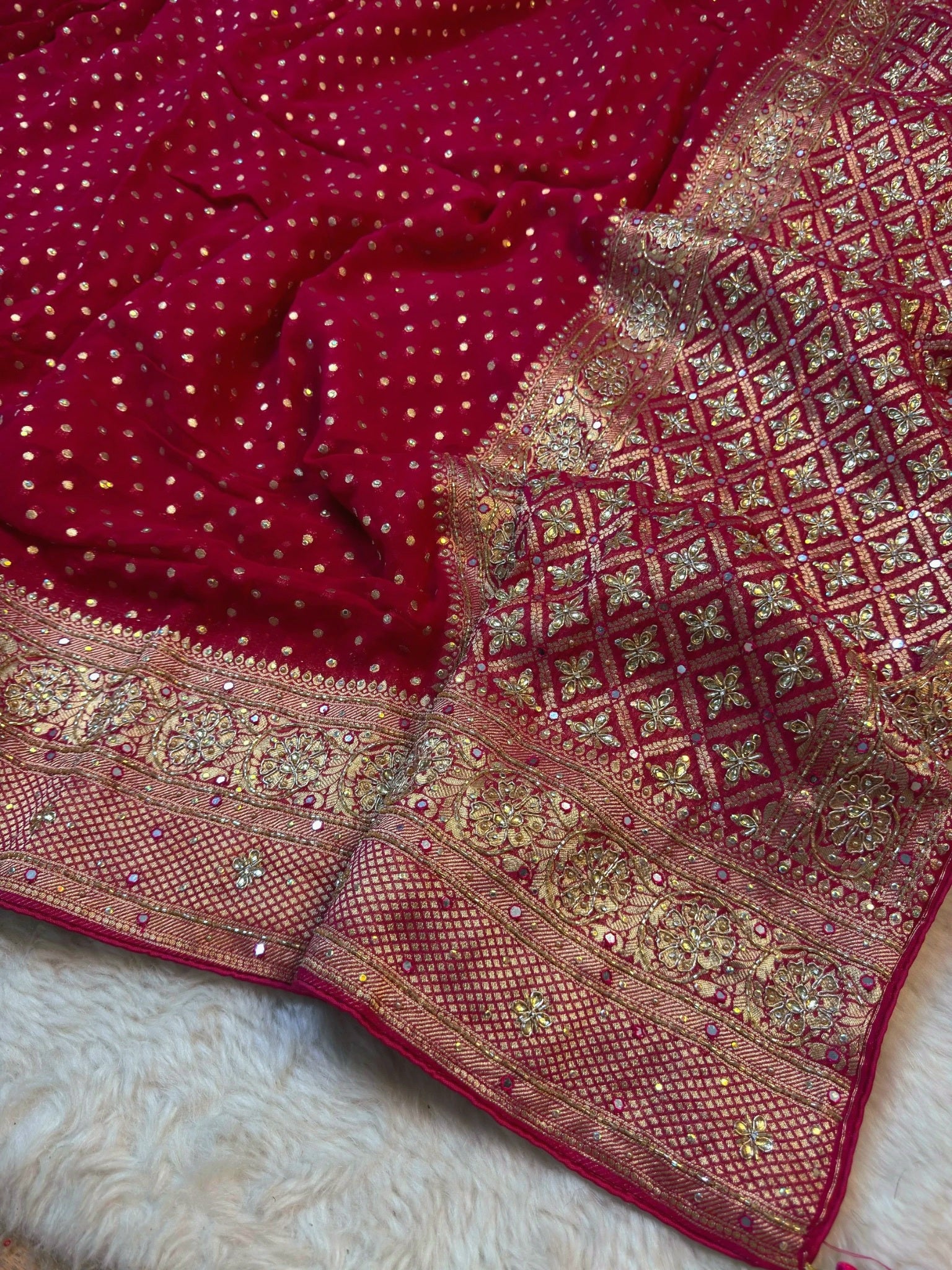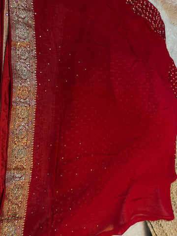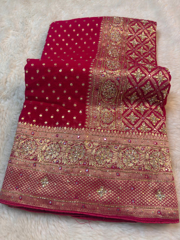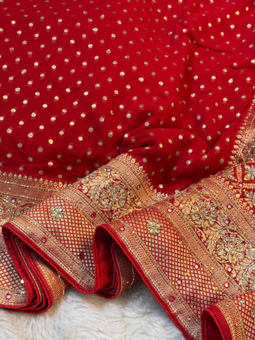 Make a timeless statement with this exquisitely crafted Khaddi Georgette saree, designed to embody regal bridal elegance. The saree features delicate golden zari butti work spread gracefully across the body, enhancing its rich and luxurious appeal.