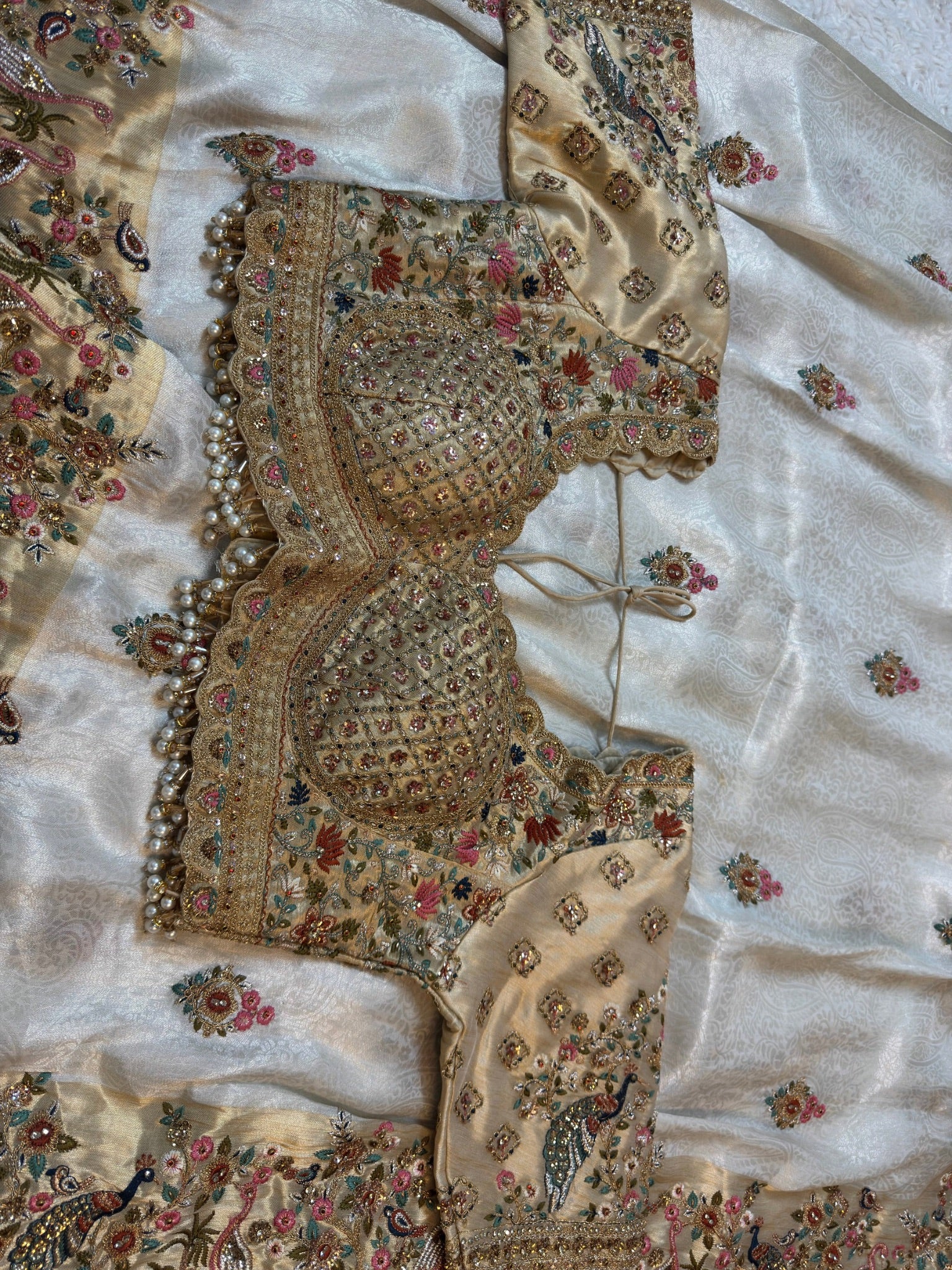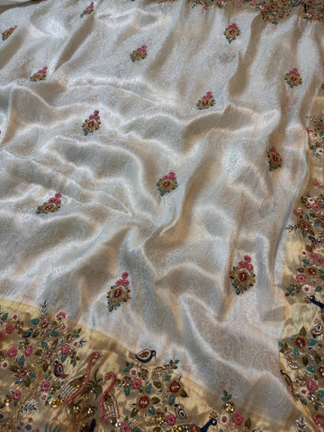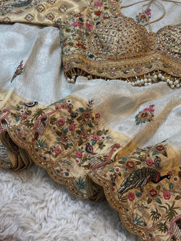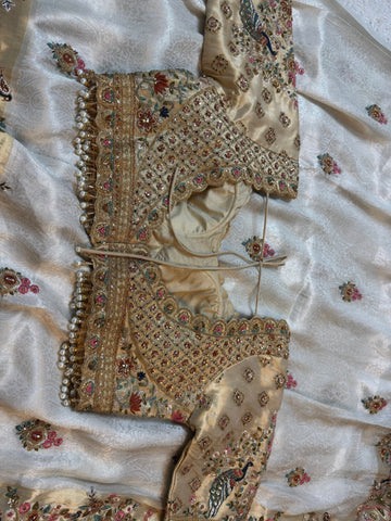 Ivory Jacquard Silk Saree with Royal Peacock and bird Embroidered Border (Stitched Blouse)