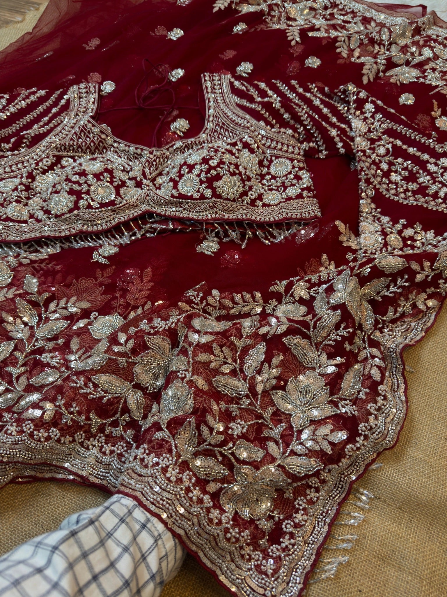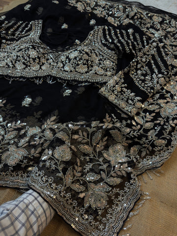 • Work: Heavy floral embroidery with sequins, beads & zari highlights