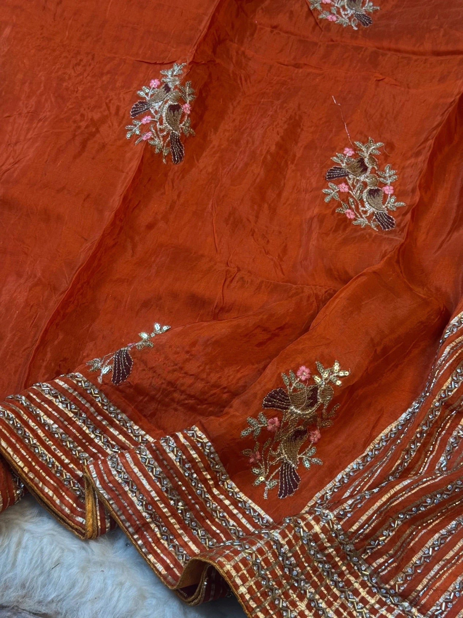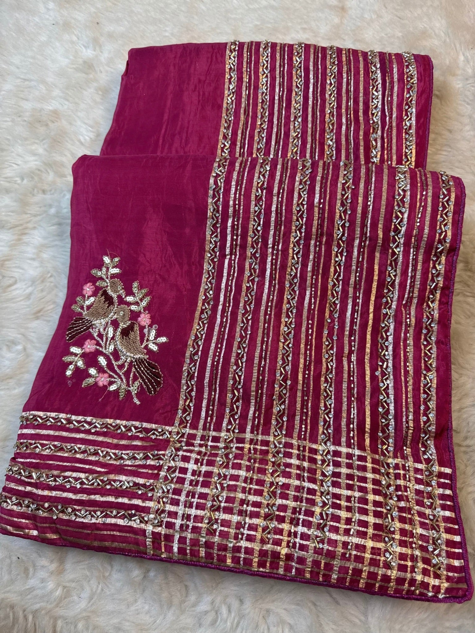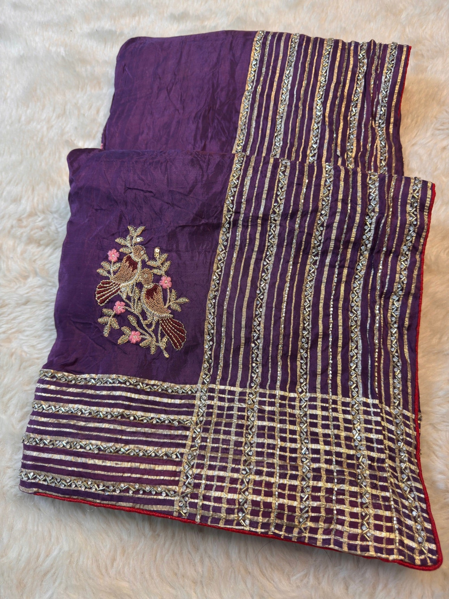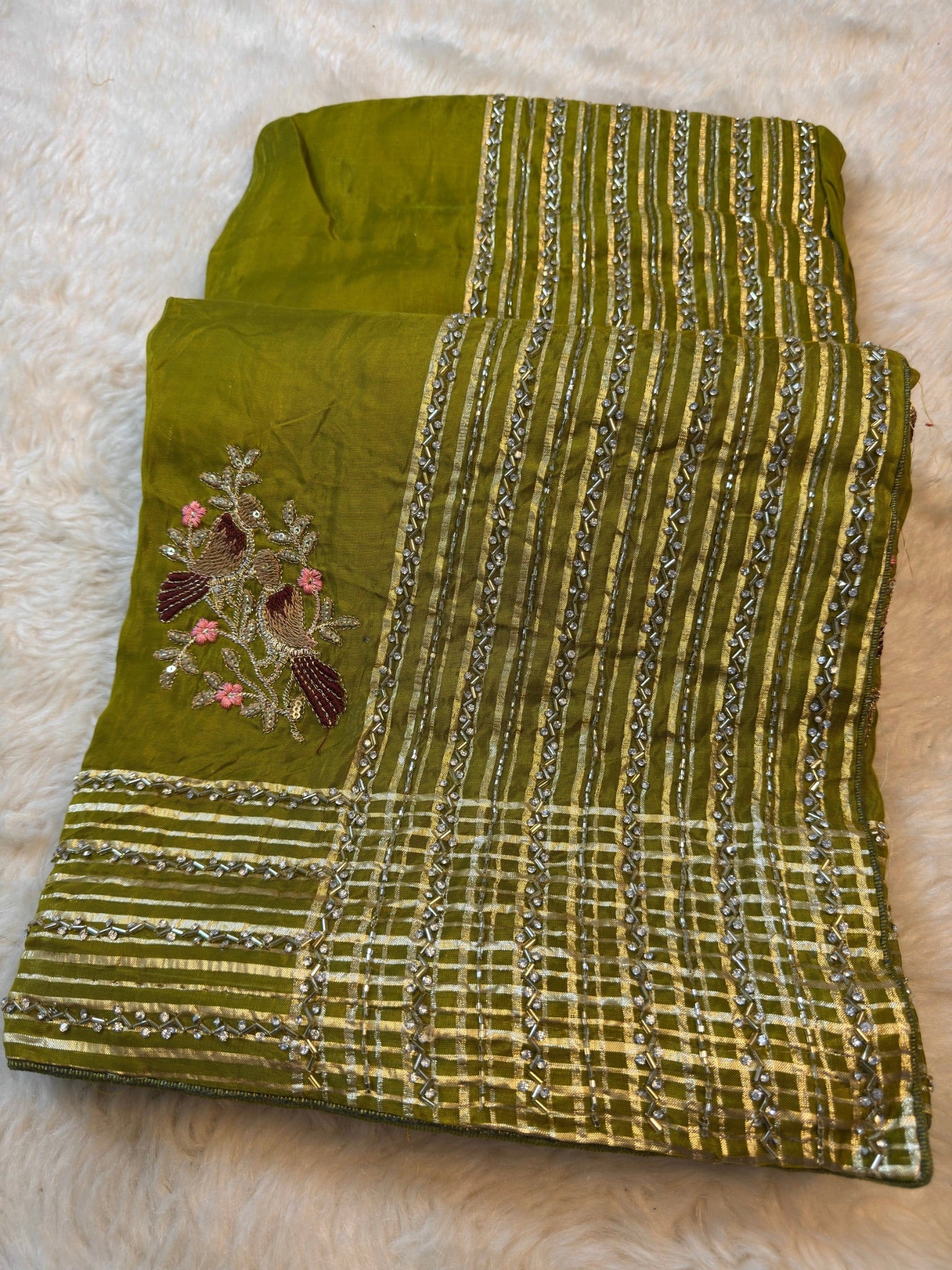 The saree features shimmering kundan-inspired stripe work throughout the body, paired with a beautifully crafted embroidered bird motif pallu that adds a regal and artistic touch. Finished with a rich woven border, this saree drapes gracefully and is perfect for weddings, festive occasions, and evening celebrations.