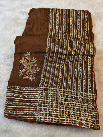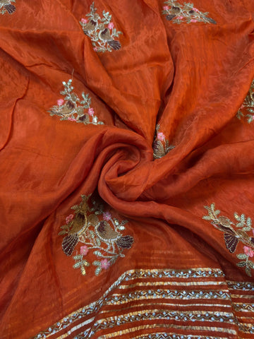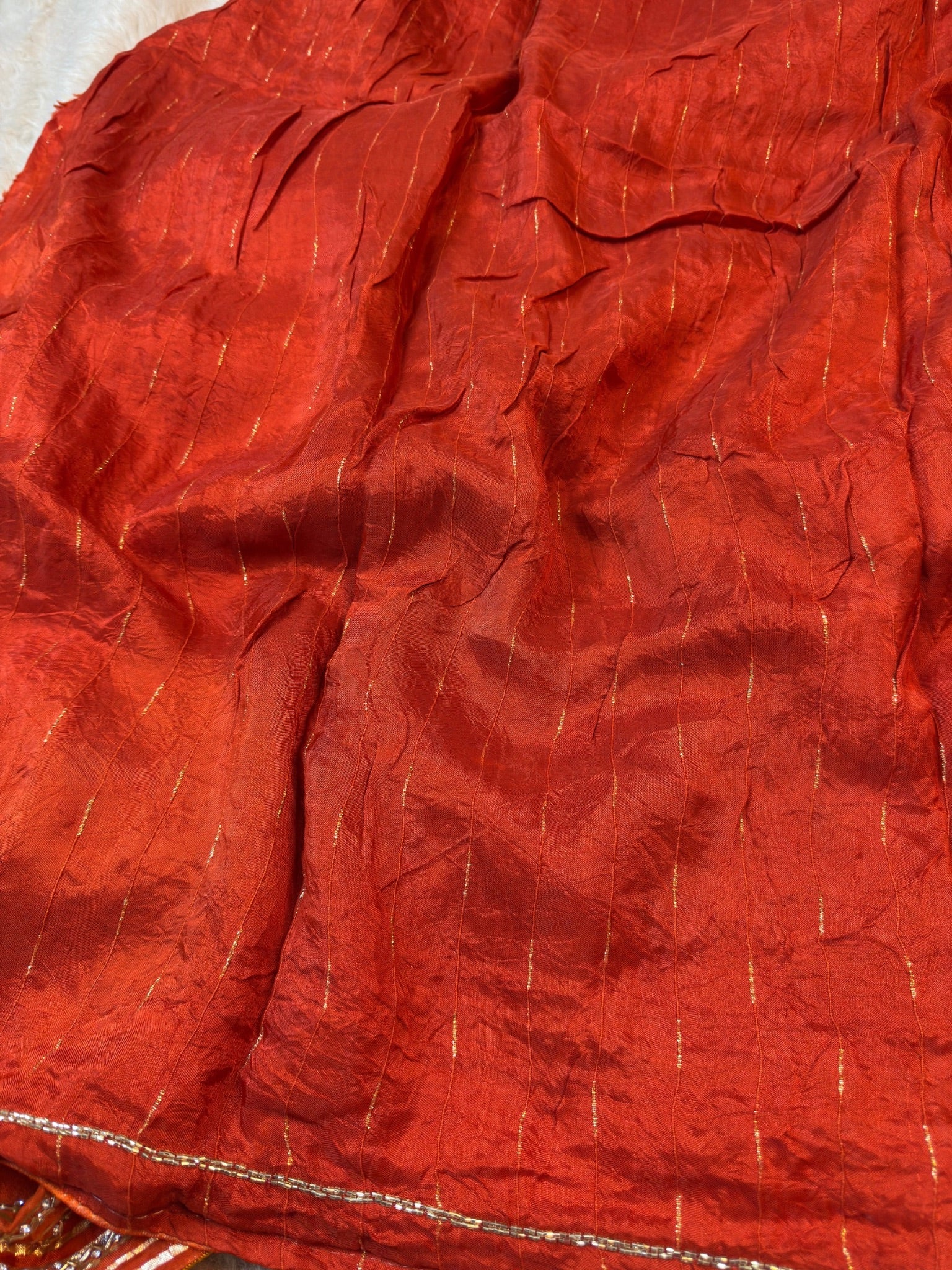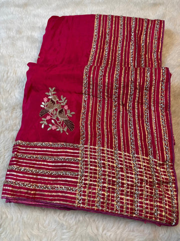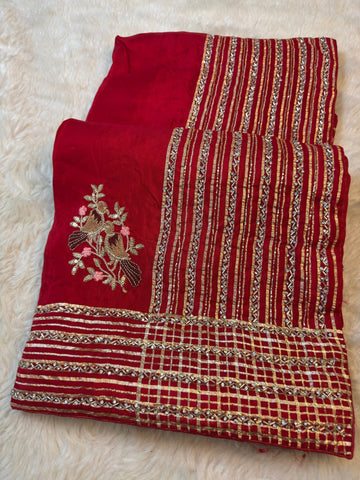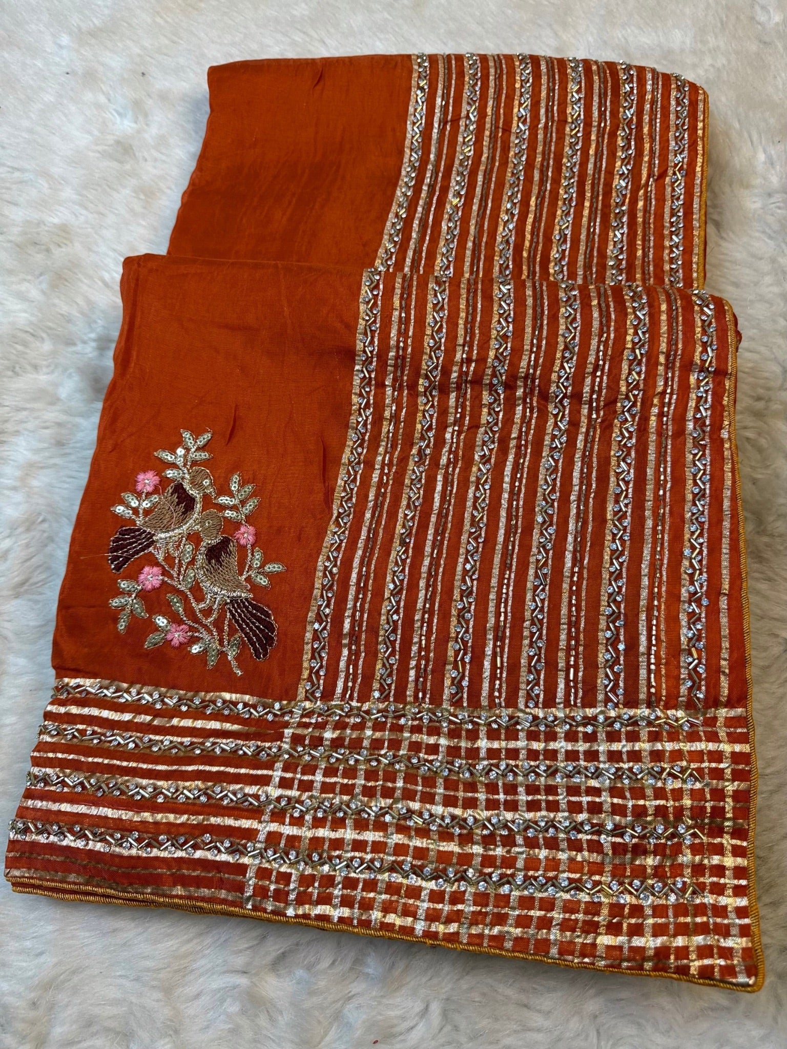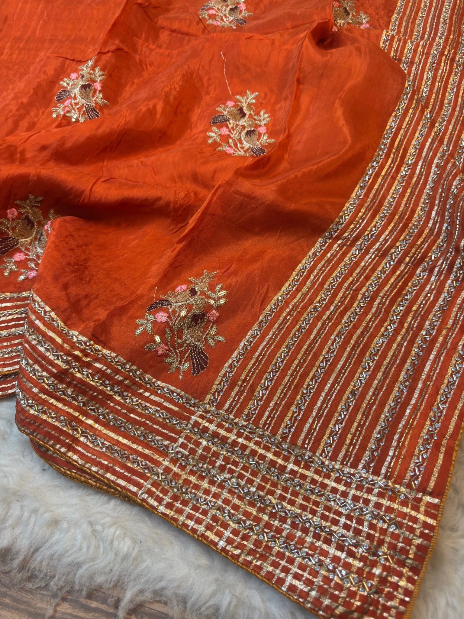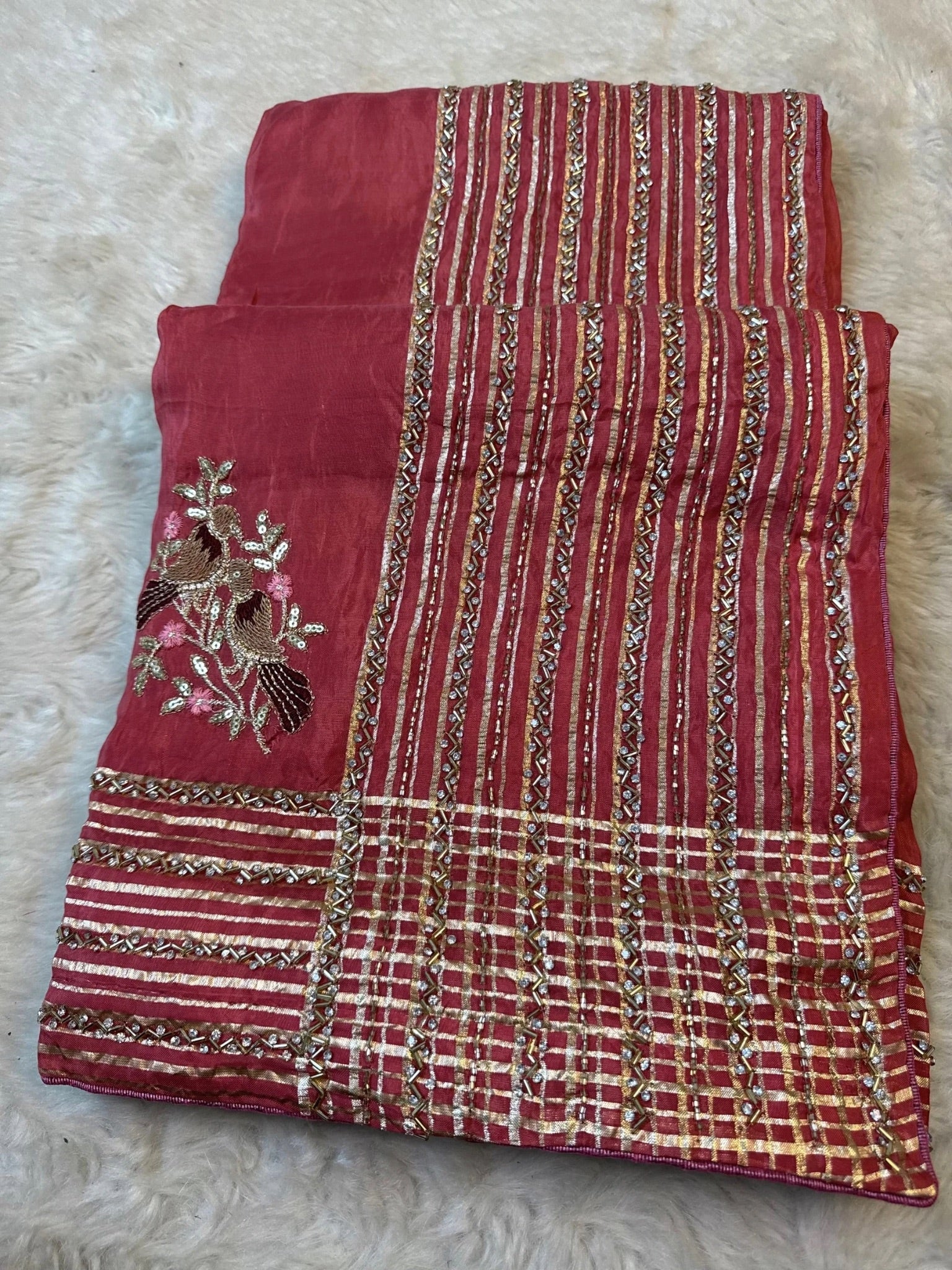 The saree features shimmering kundan-inspired stripe work throughout the body, paired with a beautifully crafted embroidered bird motif pallu that adds a regal and artistic touch. Finished with a rich woven border, this saree drapes gracefully and is perfect for weddings, festive occasions, and evening celebrations.