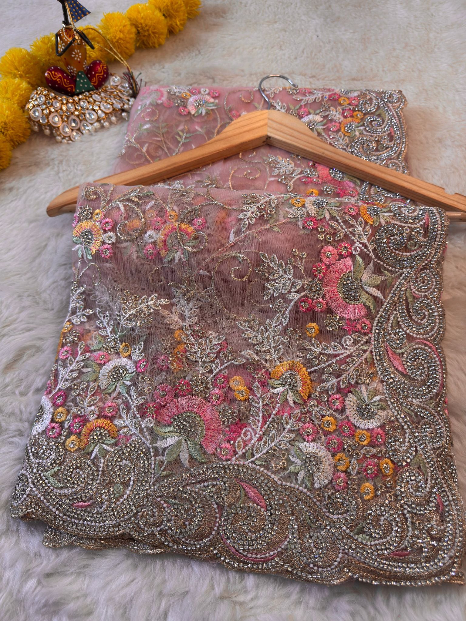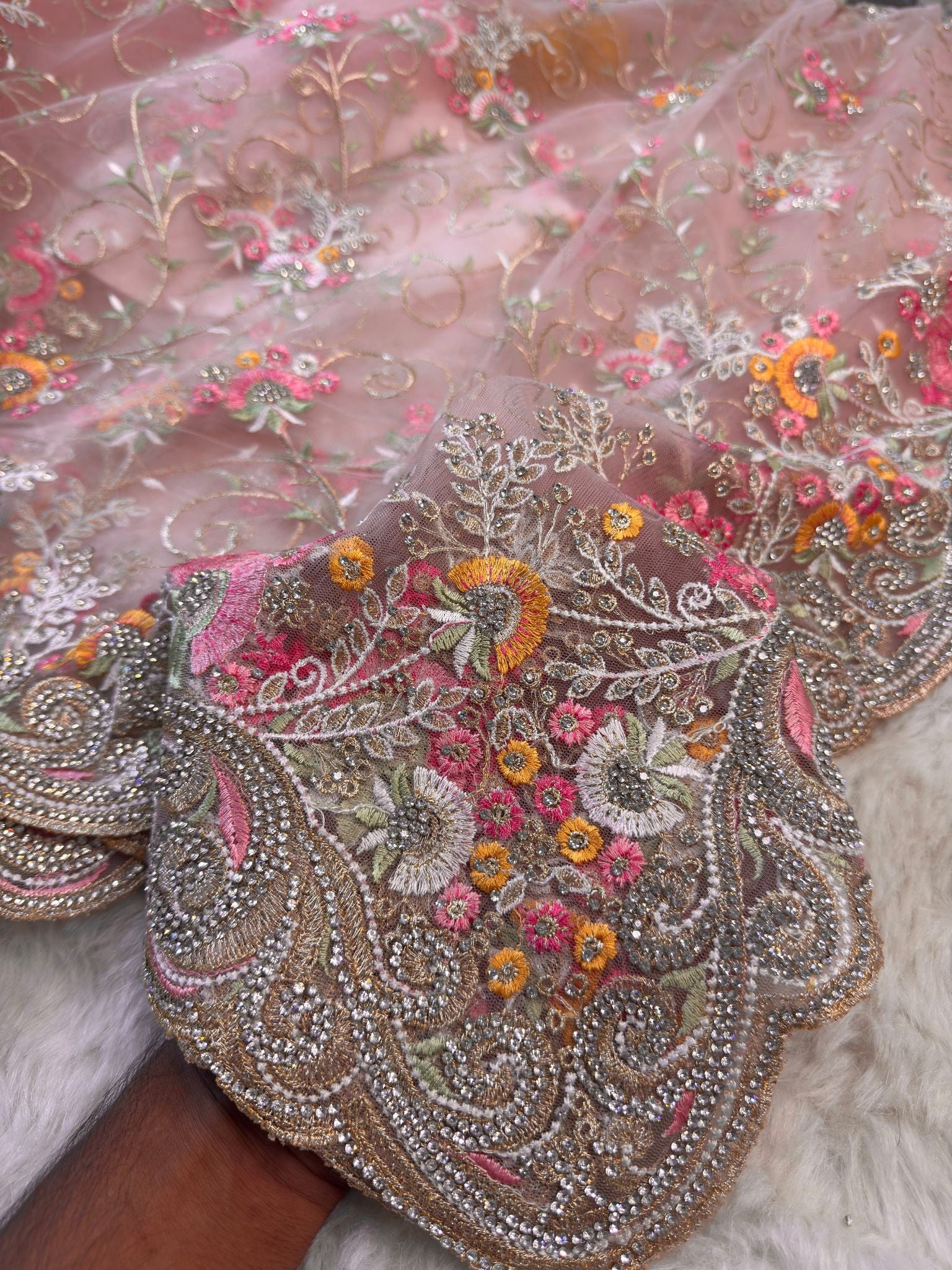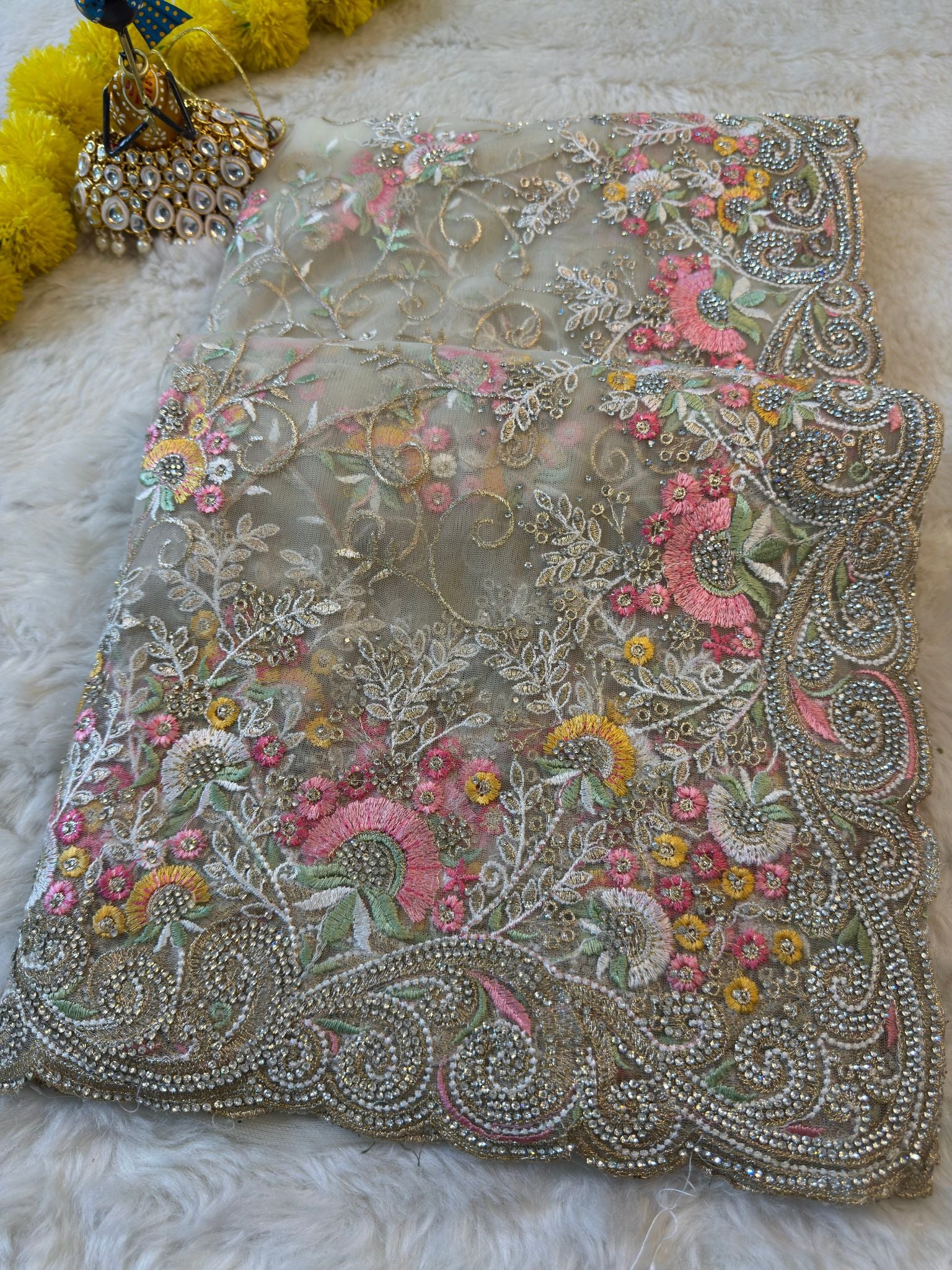 ✨ Premium Net Saree with Heavy Multicolor Embroidery & Scalloped Border