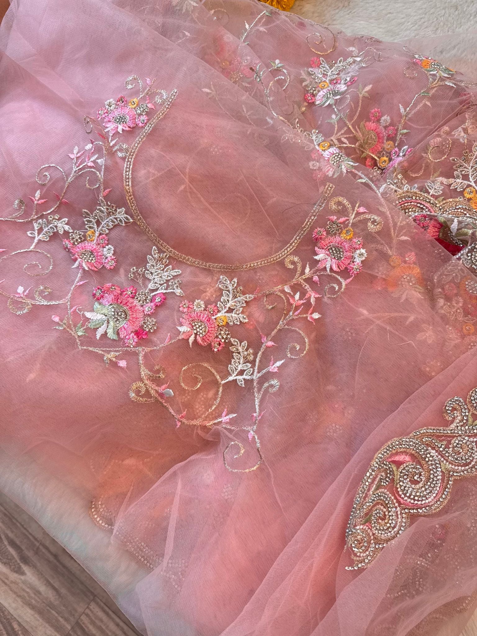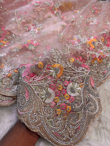 Our Floral Heritage Net Saree Collection features breathtaking multicolor embroidery with intricate cutdana, sequins, and zari threadwork. The elegant scalloped border and delicate floral motifs add a timeless charm to every drape. Perfect for receptions, weddings, or festive evenings when you want to make a regal impression.