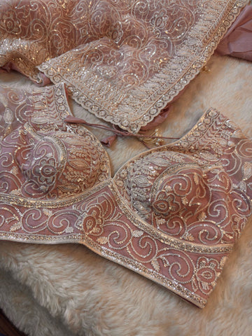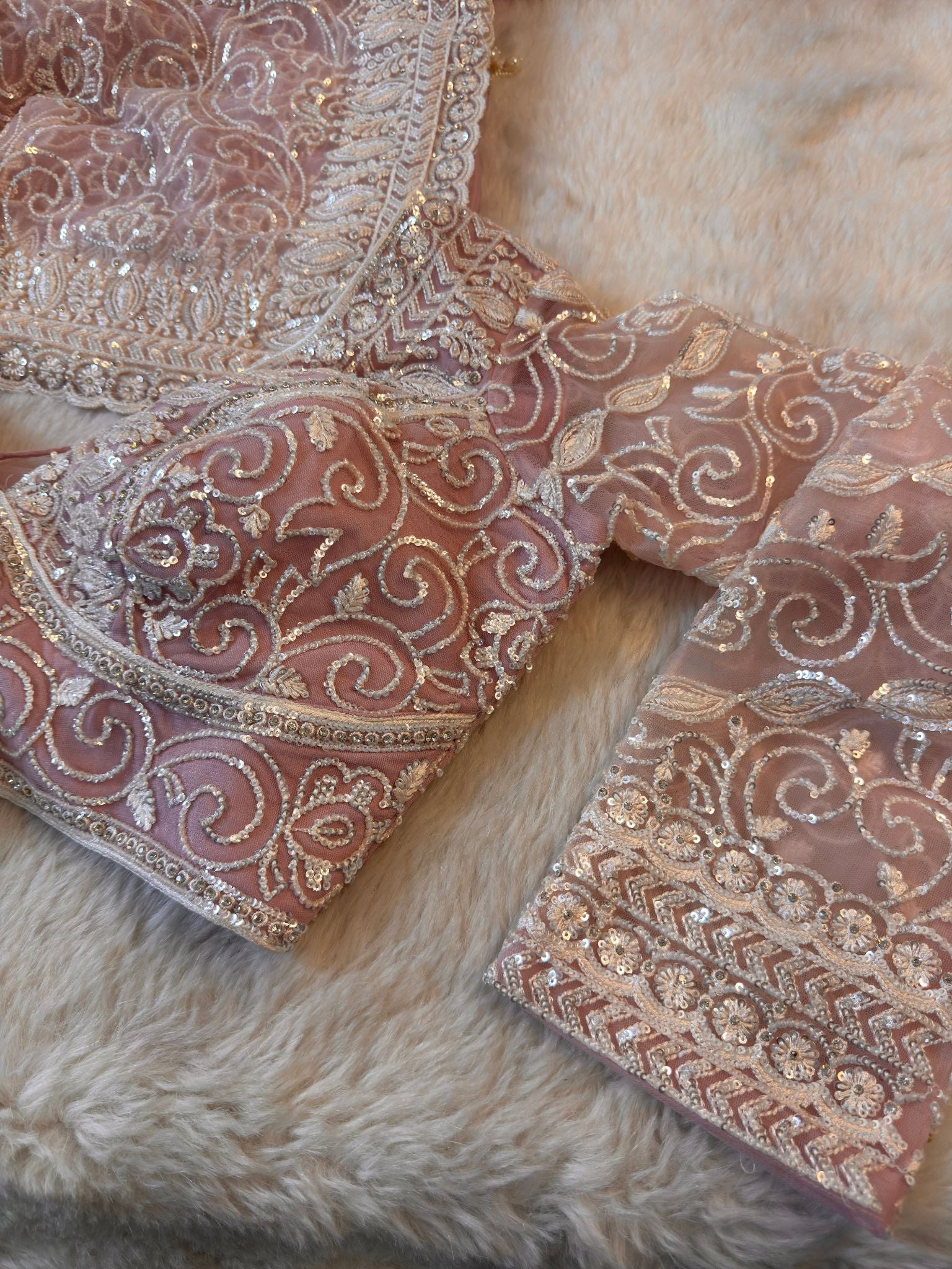 Work: All-over heavy embroidery with sequins & thread jaal. Detailed scalloped embellished border with floral and vine motifs.