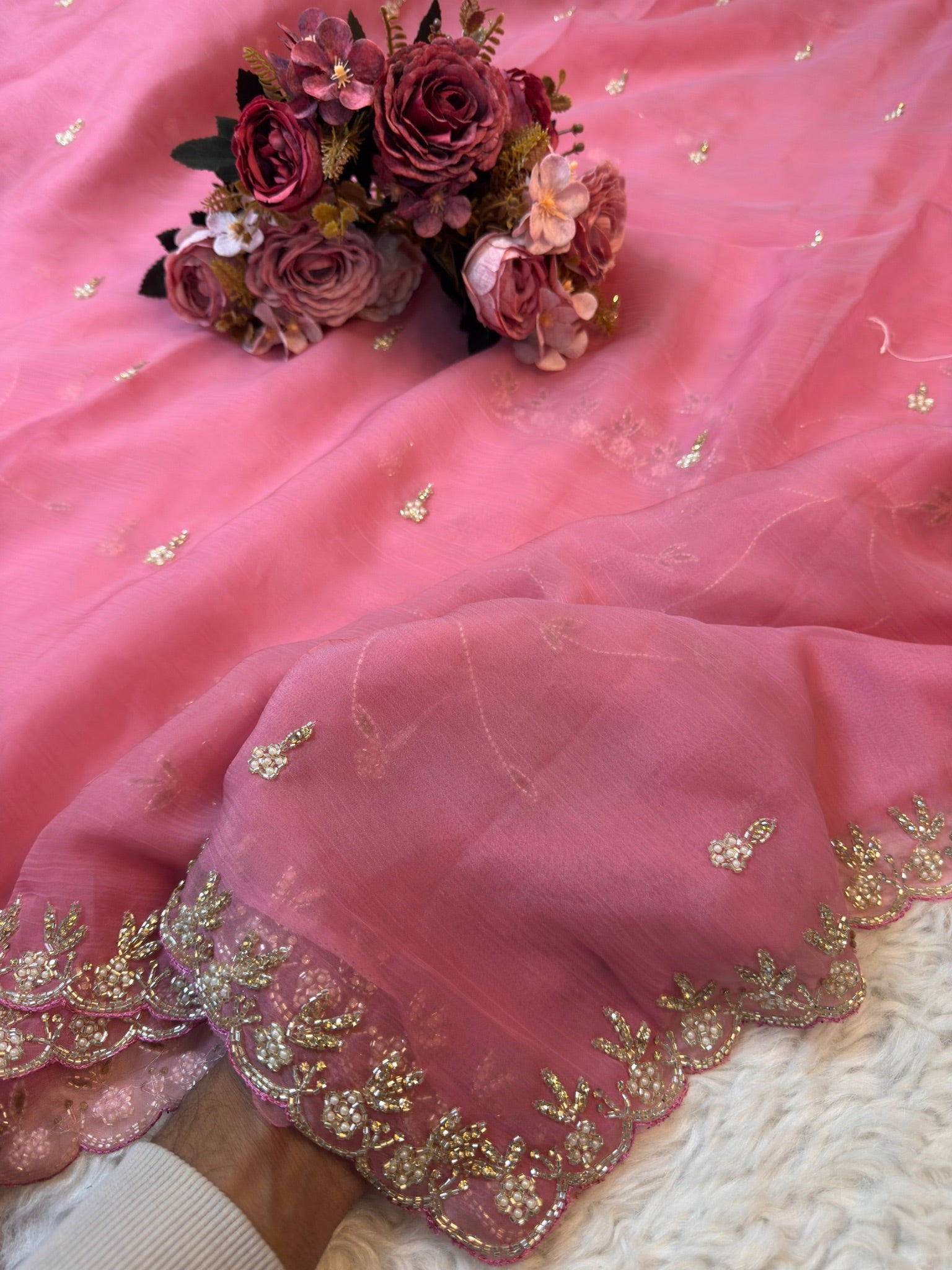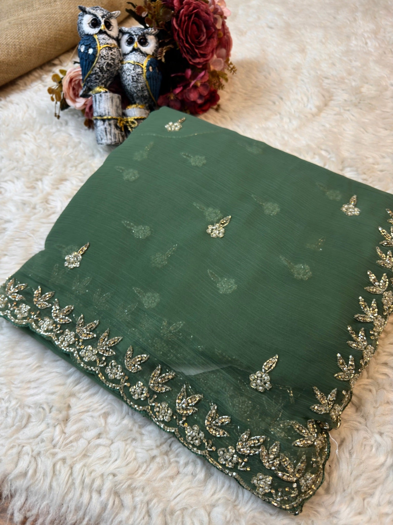 ✨ Graceful, lightweight, and effortlessly elegant — this Waree chiffon saree features delicate floral handwork motifs across the body paired with a beautifully embroidered designer scalloped border.